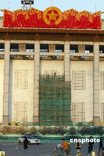 4月6日,中國國家博物館西門前罩上了綠色圍擋,工作人員正在加緊搭建上海世博會倒計時牌。據(jù)悉,該倒計時牌將于2009年5月1日上海世博會倒計時一周年之際正式亮相。全國政協(xié)常委、上海世博會執(zhí)委會執(zhí)行主任萬季飛在“兩會”期間表示,上海世博會將于明年5月1日開幕,在倒計時一周年之際,組委會將于今年5月1日在天安門廣場和國家博物館西門前豎立上海世博會倒計時牌,7月5日到15日將在首都博物館舉辦走進(jìn)世博會大型巡展。中新社發(fā) 鄭雄增 攝