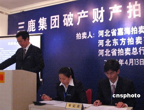 4月13日,由河北省嘉海拍賣有限公司作為主拍單位,與河北省東方拍賣有限公司、河北省拍賣總行有限公司共同進行拍賣三鹿集團部分資產(chǎn)。當(dāng)日拍賣的11項破產(chǎn)財產(chǎn),競買人顯然無意出手,其中天津三鹿乳業(yè)51%的股權(quán)竟叫出20萬元的起拍價,最終也無人問津,三鹿集團第4批破產(chǎn)財產(chǎn)全部流拍。中新社發(fā) 翟羽佳 攝