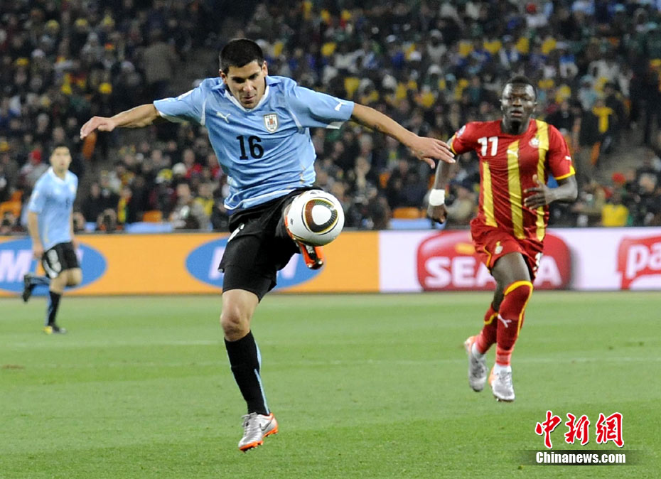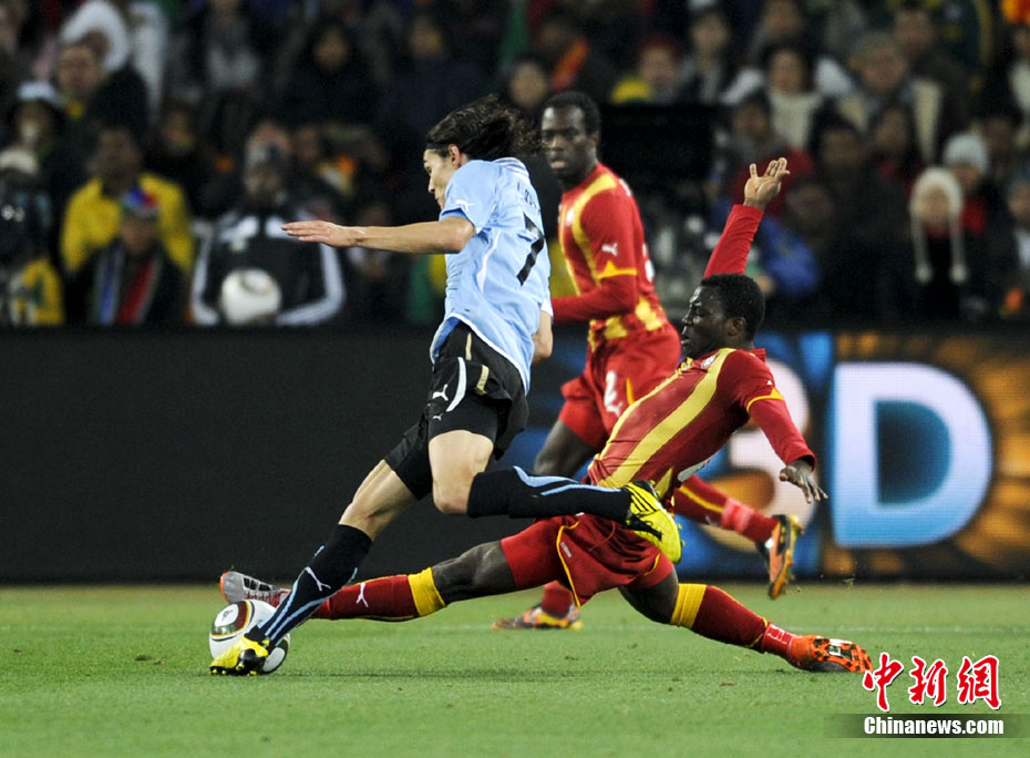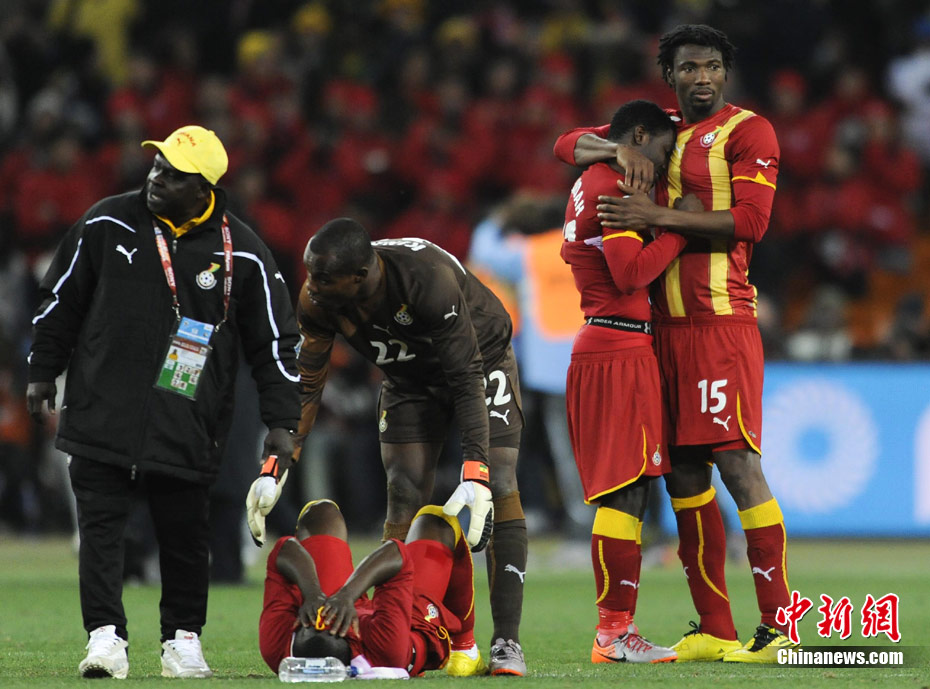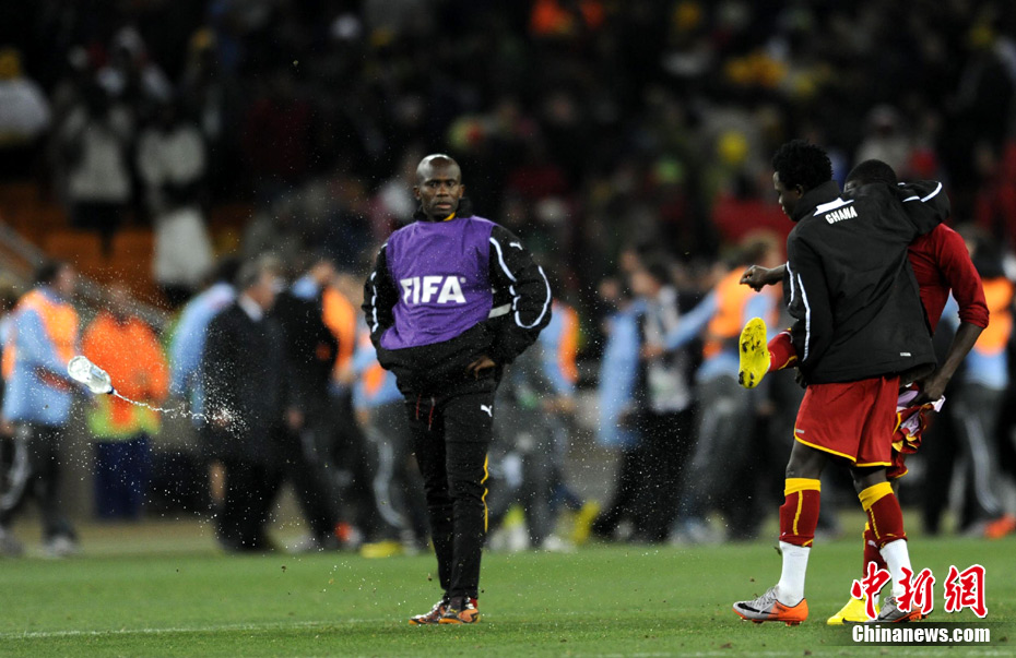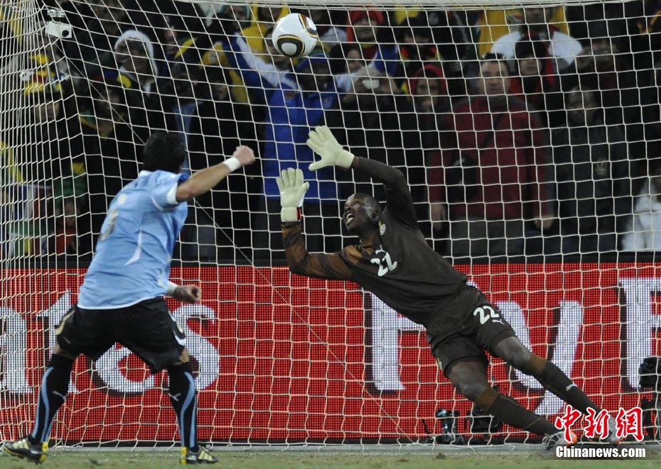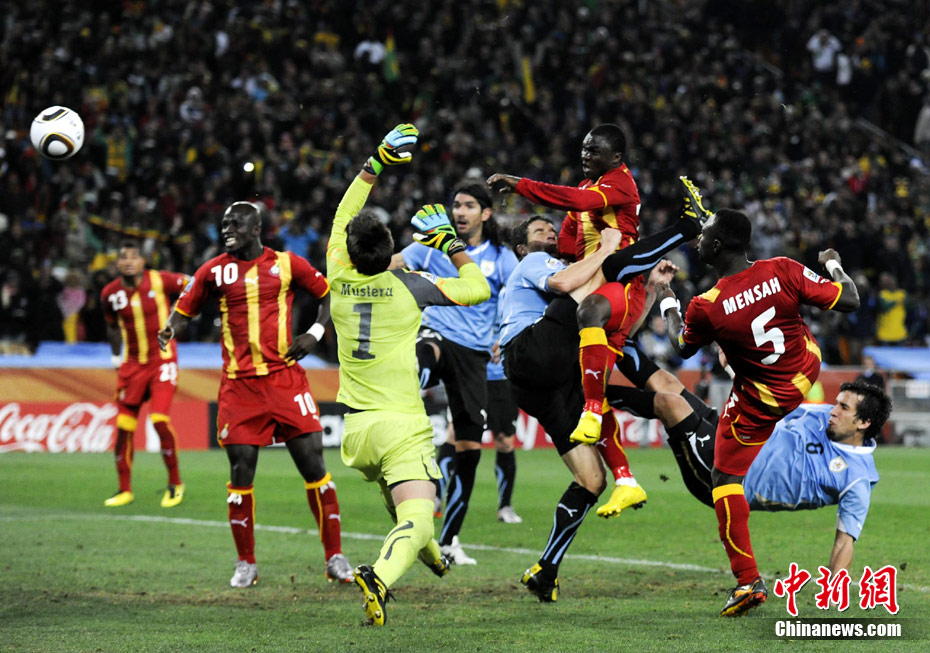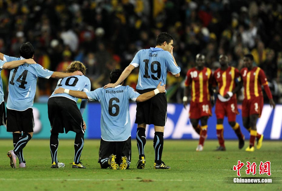 北京時間7月3日凌晨2:30,南非世界杯進(jìn)行了1/4決賽的第二場爭奪,由烏拉圭在約翰內(nèi)斯堡的足球城球場迎戰(zhàn)加納隊。120分鐘時間內(nèi),雙方憑借弗蘭和蒙塔里的進(jìn)球,1-1戰(zhàn)成平局。在點球大戰(zhàn)中,烏拉圭4-2擊敗對手,晉級半決賽。 中新社記者 廖攀 攝