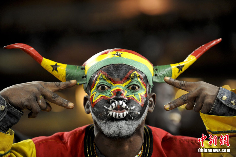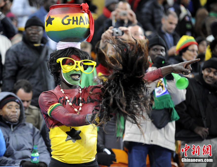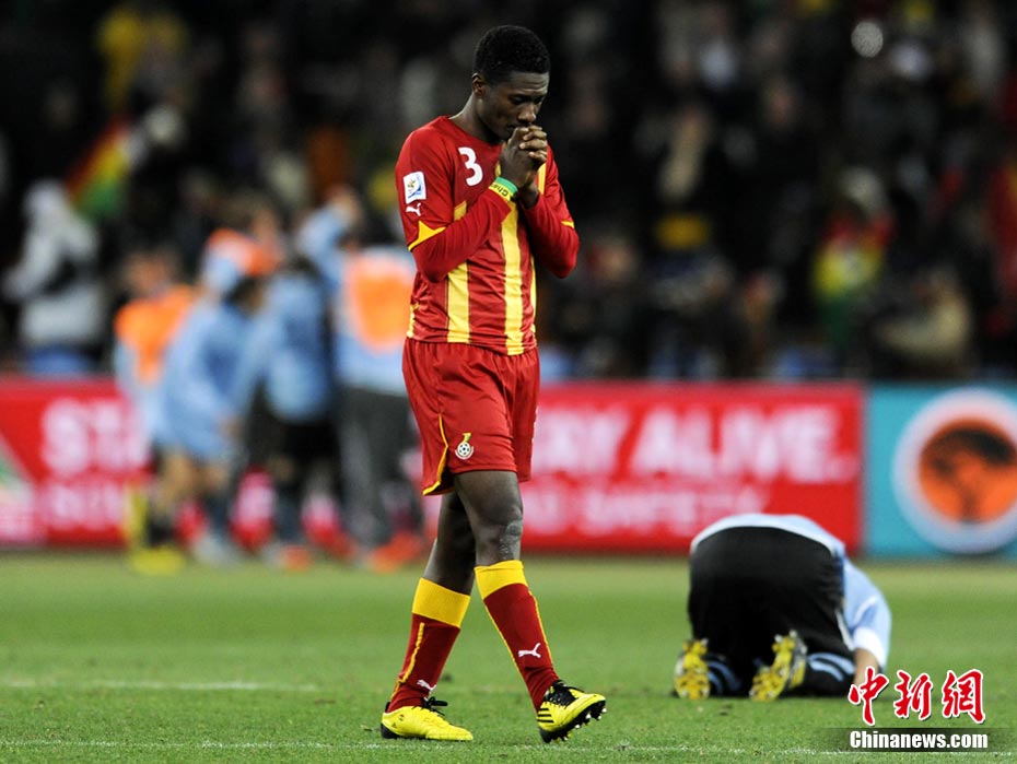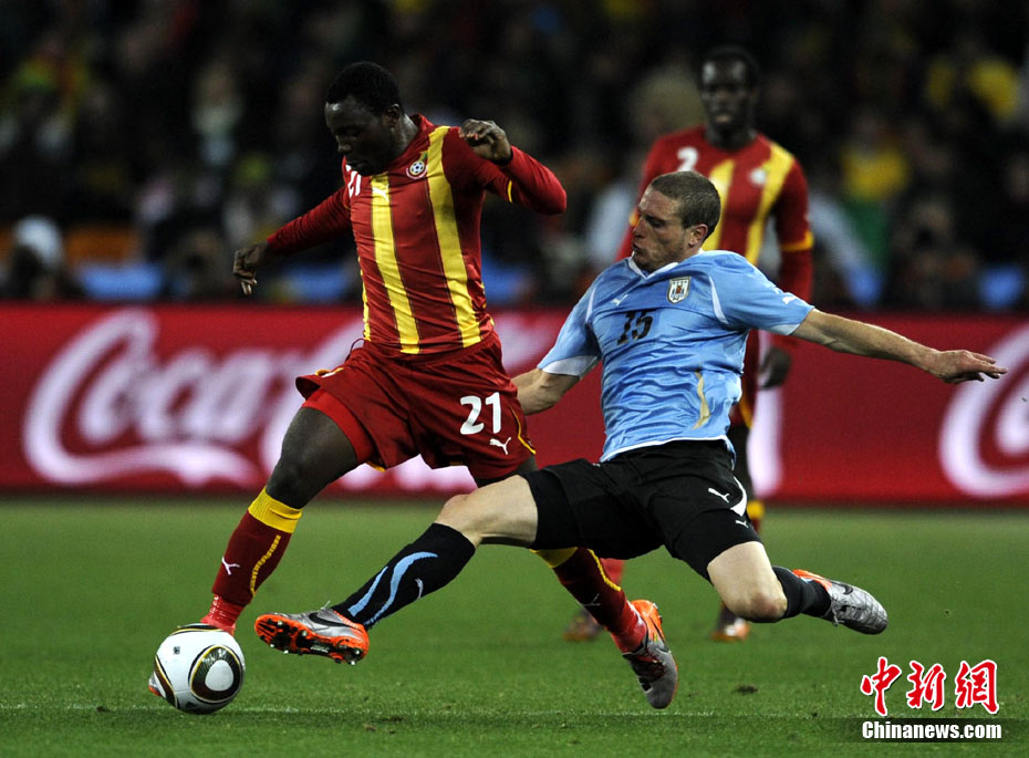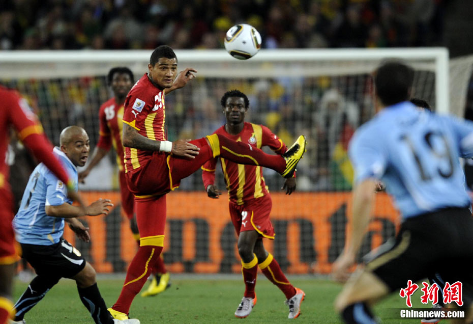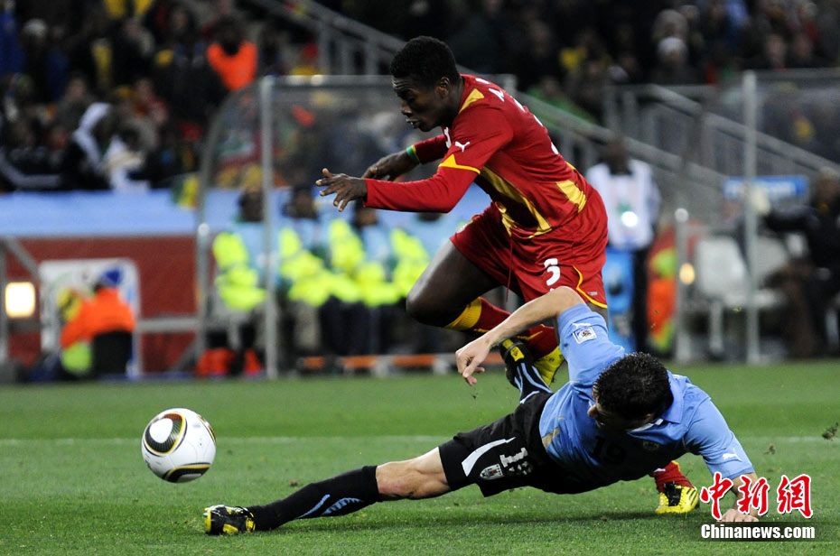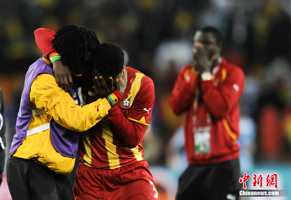 北京時間7月3日凌晨2:30,南非世界杯進(jìn)行了1/4決賽的第二場爭奪,由烏拉圭在約翰內(nèi)斯堡的足球城球場迎戰(zhàn)加納隊。120分鐘時間內(nèi),雙方憑借弗蘭和蒙塔里的進(jìn)球,1-1戰(zhàn)成平局。在點球大戰(zhàn)中,烏拉圭4-2擊敗對手,晉級半決賽。 中新社記者 廖攀 攝