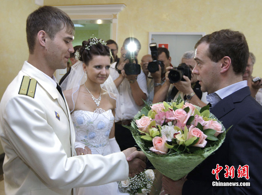7月1日,俄總統(tǒng)梅德韋杰夫在遠(yuǎn)東視察時(shí),參觀了當(dāng)?shù)匾惶幓橐龅怯浱帲蔀槿龑π氯说幕槎Y見證人,并給他們送上了非常貴重的禮物。