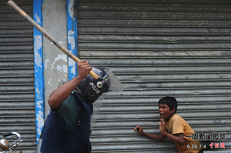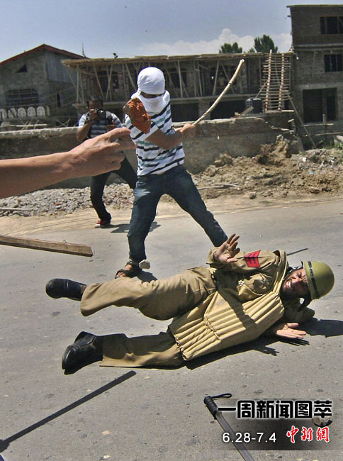28日(周一),在印控克什米爾地區(qū)首府斯利那加市郊,當(dāng)?shù)啬滤沽衷谂e行抗議活動時(shí)與警察發(fā)生沖突,兩名穆斯林在沖突中喪生。圖為警察在沖突中被打倒在地。