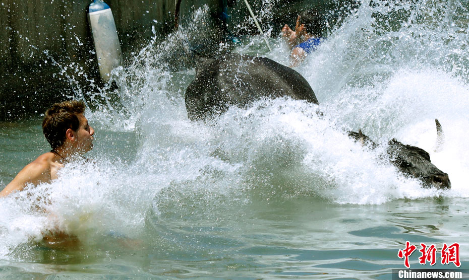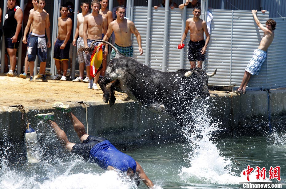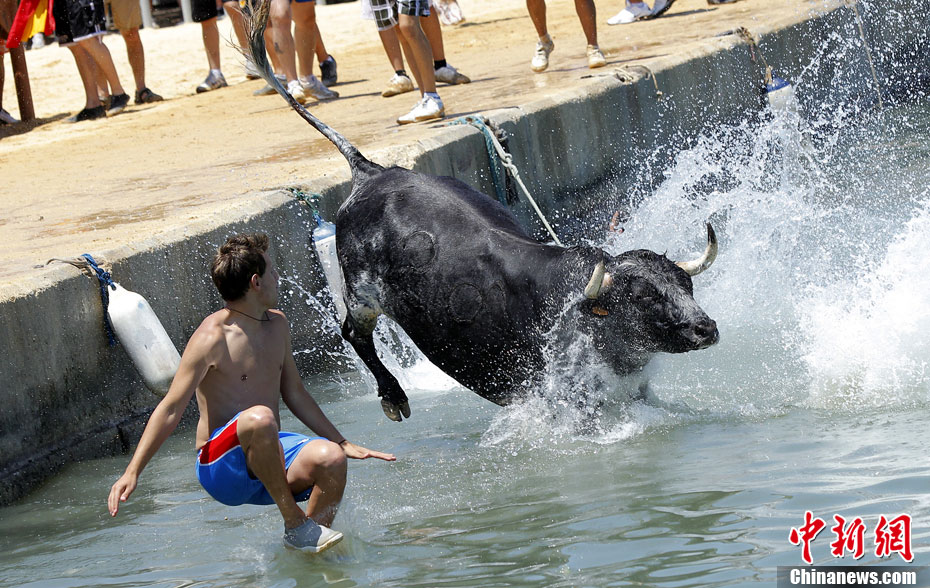 7月5日,西班牙東部德尼那小鎮(zhèn)一年一度的海邊奔牛節(jié)再度舉行。這里的奔牛節(jié)與眾不同,斗牛士們挑逗著一頭頭暴躁的公牛跳入海中,俗稱(chēng)“奔牛入!眻(chǎng)面蔚為壯觀(guān)。
