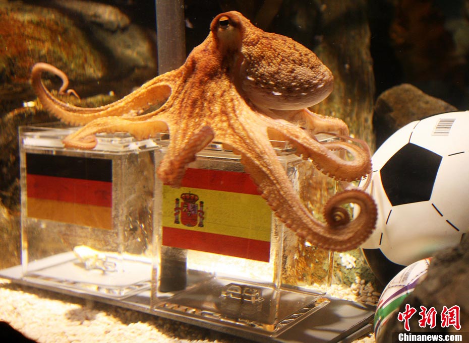 7月6日下午,德國某水族館的章魚保羅再次出動(dòng),對(duì)世界杯半決賽德國與西班牙進(jìn)行了預(yù)測,最終他選擇了西班牙。保羅認(rèn)為歐洲冠軍西班牙將在半決賽擊敗勢頭強(qiáng)勁的德國隊(duì)進(jìn)入決賽!秷D片報(bào)》網(wǎng)站的直播員在公布結(jié)果的同時(shí)說道:“希望勒夫的小伙子們能扭轉(zhuǎn)局勢,拯救這場半決賽!被蛟S,對(duì)于德國球迷來說還有一個(gè)自我安慰的理由:保羅在2008年歐錦賽上預(yù)測的準(zhǔn)確率是80%,并且唯一錯(cuò)的就是決賽與西班牙之戰(zhàn)。他們或許已經(jīng)開始期待:兩年后的世界杯預(yù)測不要百發(fā)百中,至少在半決賽時(shí)錯(cuò)一次。
