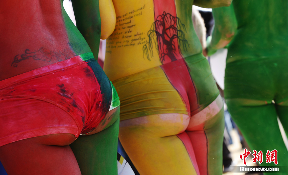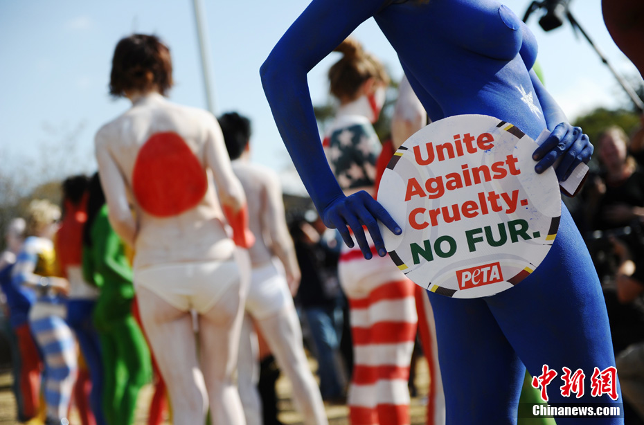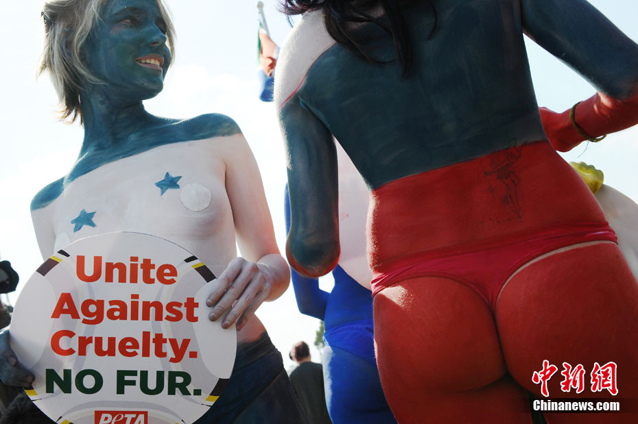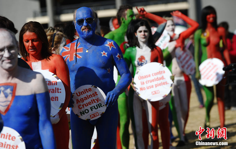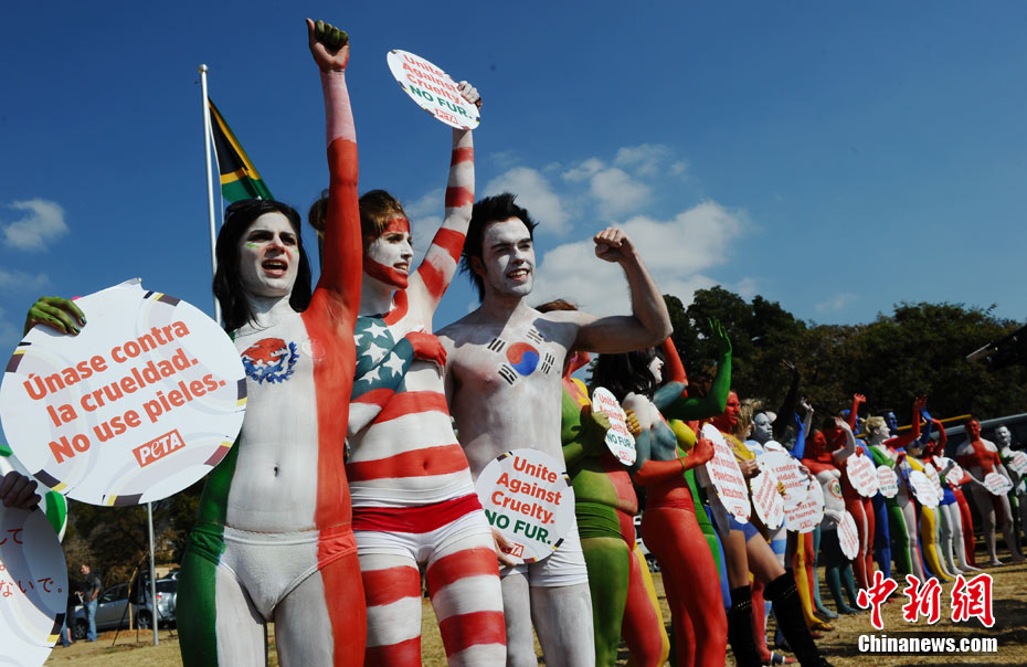 7月8日,南非世界杯賽場外,善待動物組織(PETA)舉行彩繪游行。參與者身體上畫各國的國旗,并舉著寫有“團結(jié)起來 抗議使用皮草”的標語牌。