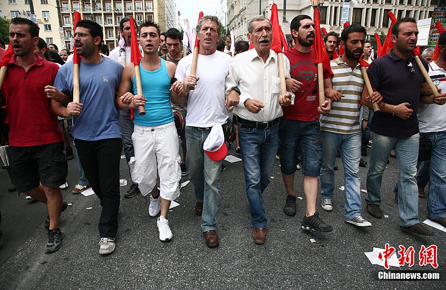 當?shù)貢r間7月8日,希臘爆發(fā)了新一輪大罷工,抗議政府提前退休年齡,克扣養(yǎng)老金等嚴厲削減公共開支的措施。警方估計,僅在首都雅典,就有1.2萬人走上街頭游行示威。據(jù)悉,這場為期24小時的罷工當天導致希臘全國交通幾乎癱瘓,火車停運、航班被迫延誤、旅游渡輪停止航行,前往希臘旅游的游客要到9日才能搭乘渡輪。政府公共機構、學校、醫(yī)院、國營企業(yè)的正常運營遭到沉重打擊。