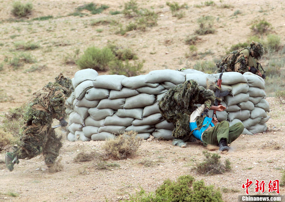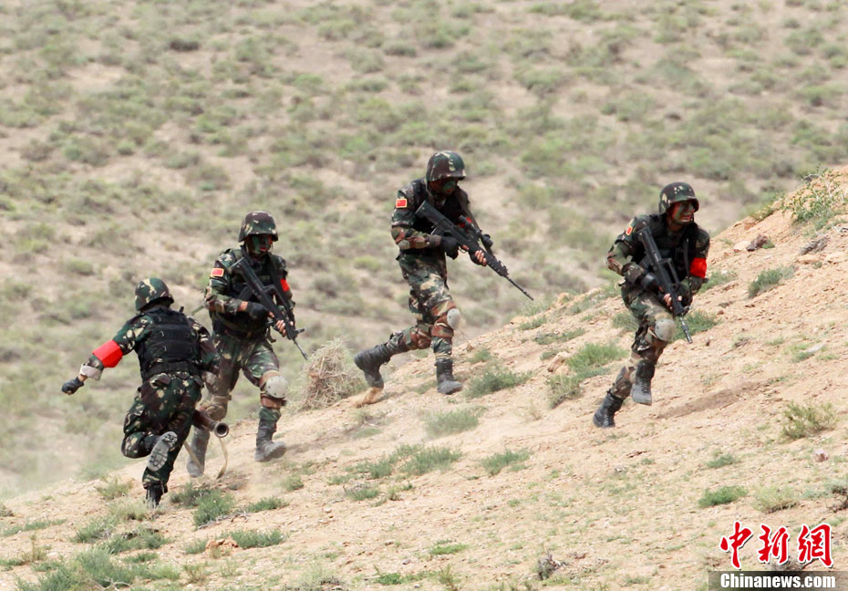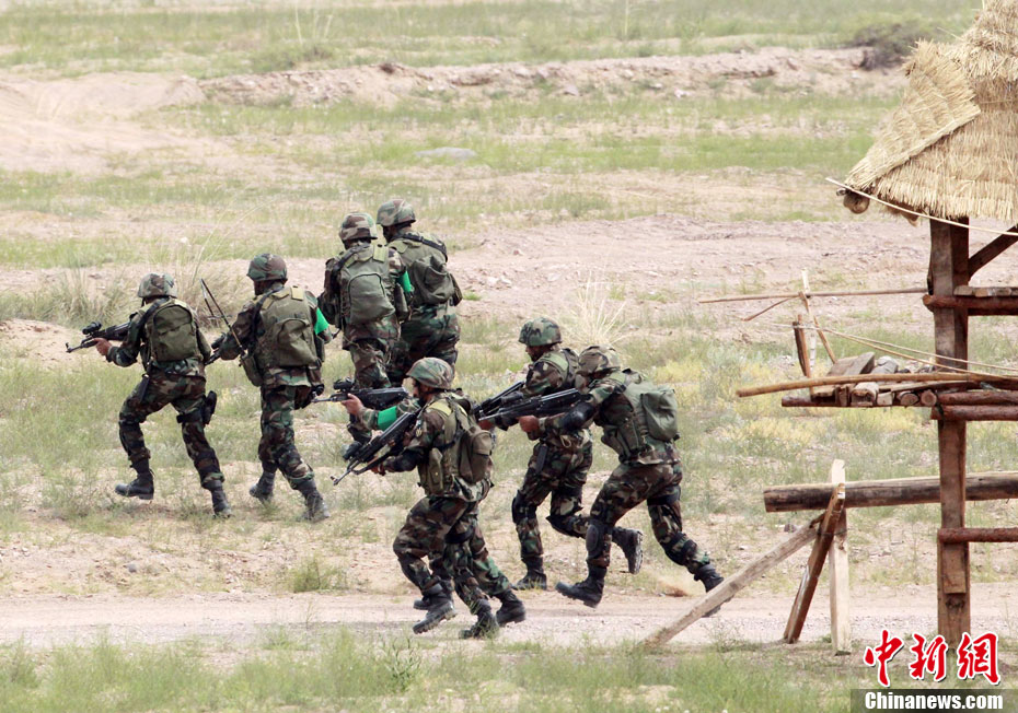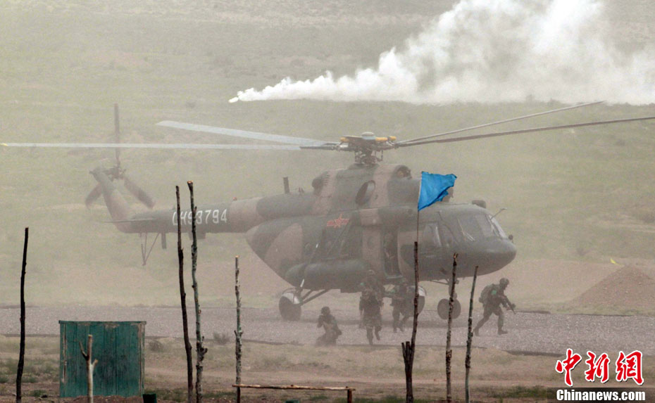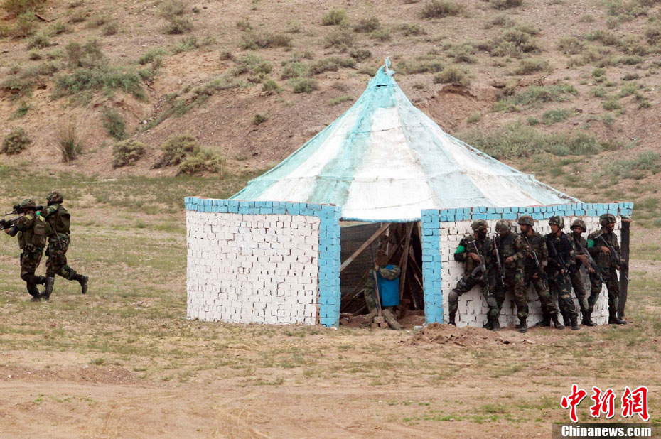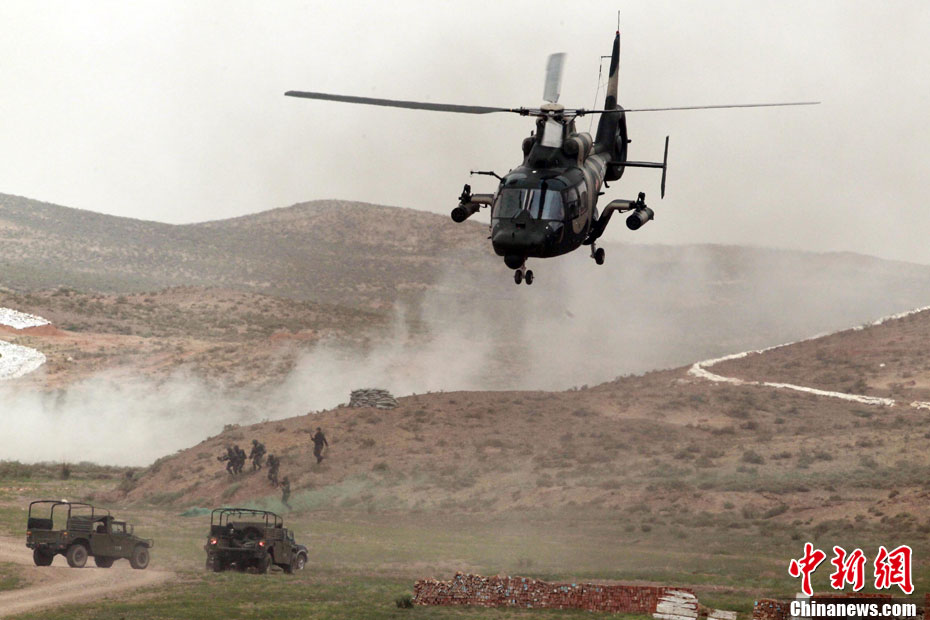 7月9日,友誼-2010”中巴反恐聯(lián)訓在蘭州軍區(qū)某訓練基地舉行實兵實彈演練,演練設計的背景是,對潛入中巴邊境地區(qū)實施襲擊破壞的國際恐怖分子進行聯(lián)合打擊。圍繞“邊境地區(qū)山地聯(lián)合反恐作戰(zhàn)”這一課題,演練了遠程投送、偵察監(jiān)視、立體封控、精確打擊、解救人質、搜剿圍殲6個行動。這次反恐聯(lián)演的一個亮點,就是首次空地協(xié)同,聯(lián)合打擊,由地面反恐特戰(zhàn)人員引導殲轟機、武裝直升機實施空中火力突擊,采取精打要害的戰(zhàn)法,以建制內的火器對恐怖分子營地重要目標實施火力打擊。中新社發(fā) 杜洋 攝
