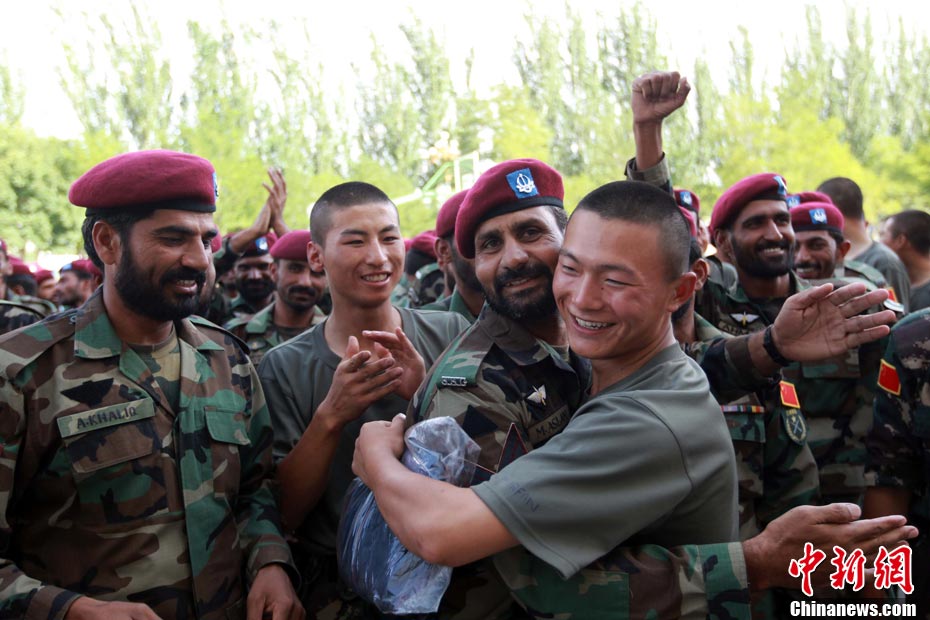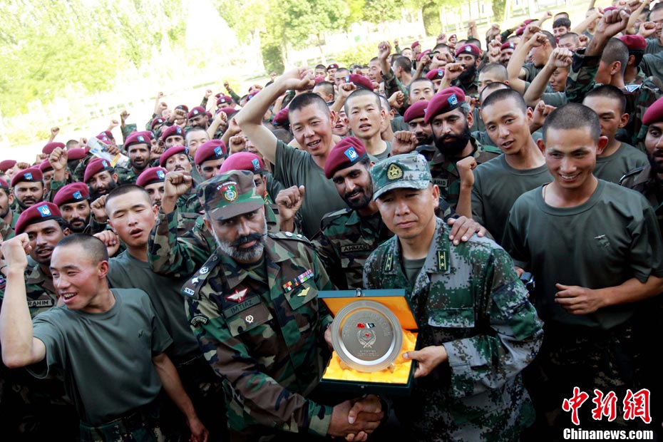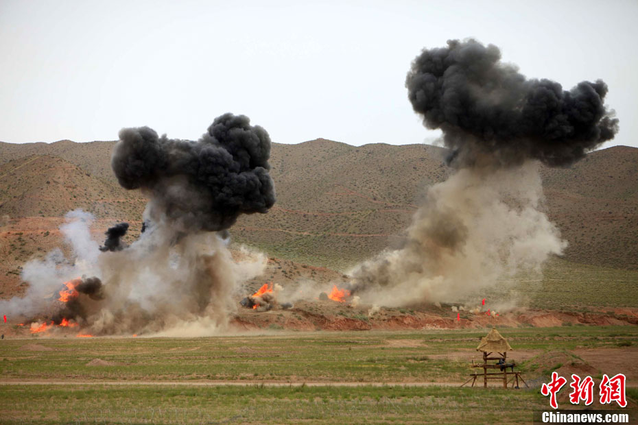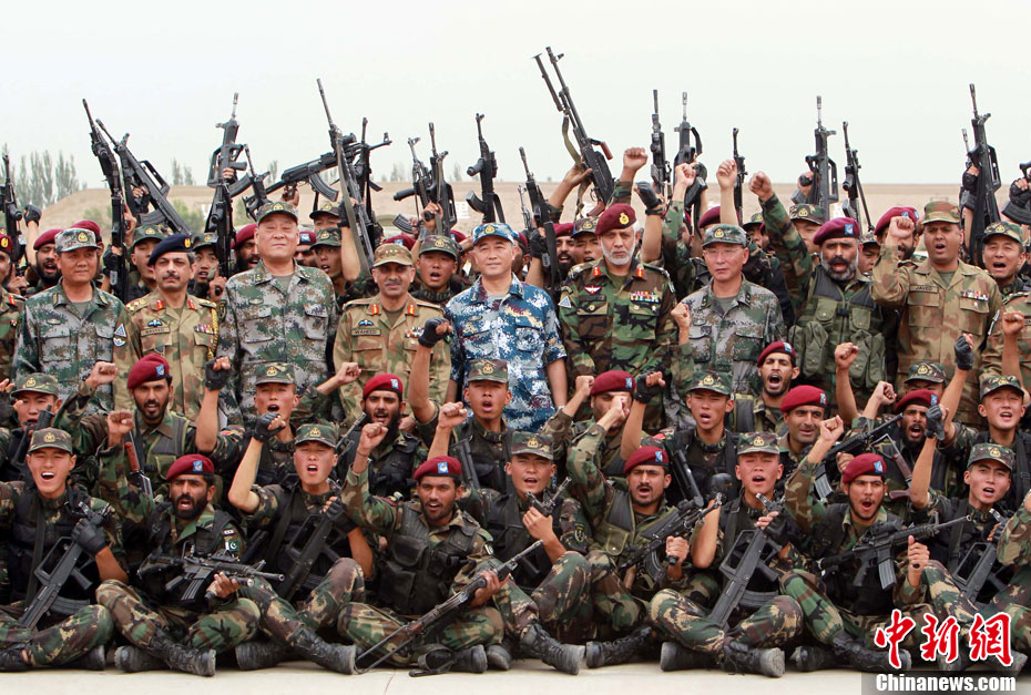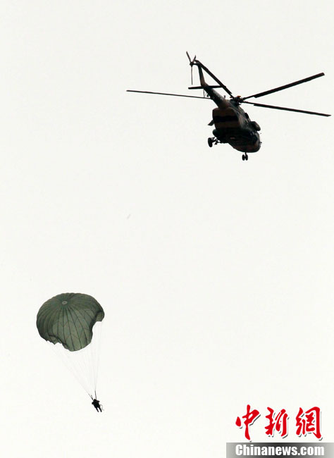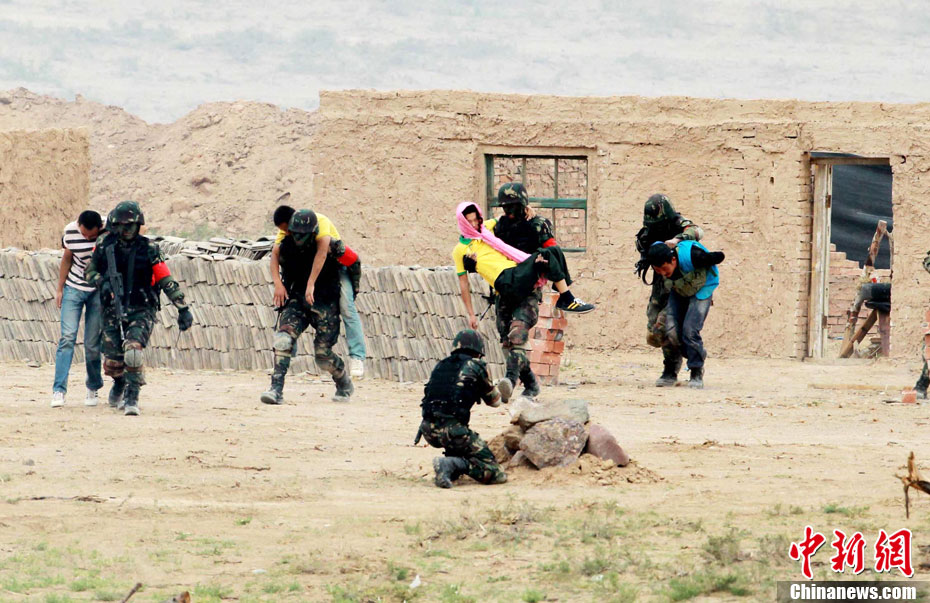 7月9日,友誼-2010”中巴反恐聯(lián)訓在蘭州軍區(qū)某訓練基地舉行實兵實彈演練,演練設計的背景是,對潛入中巴邊境地區(qū)實施襲擊破壞的國際恐怖分子進行聯(lián)合打擊。圍繞“邊境地區(qū)山地聯(lián)合反恐作戰(zhàn)”這一課題,演練了遠程投送、偵察監(jiān)視、立體封控、精確打擊、解救人質、搜剿圍殲6個行動。這次反恐聯(lián)演的一個亮點,就是首次空地協(xié)同,聯(lián)合打擊,由地面反恐特戰(zhàn)人員引導殲轟機、武裝直升機實施空中火力突擊,采取精打要害的戰(zhàn)法,以建制內的火器對恐怖分子營地重要目標實施火力打擊。中新社發(fā) 杜洋 攝