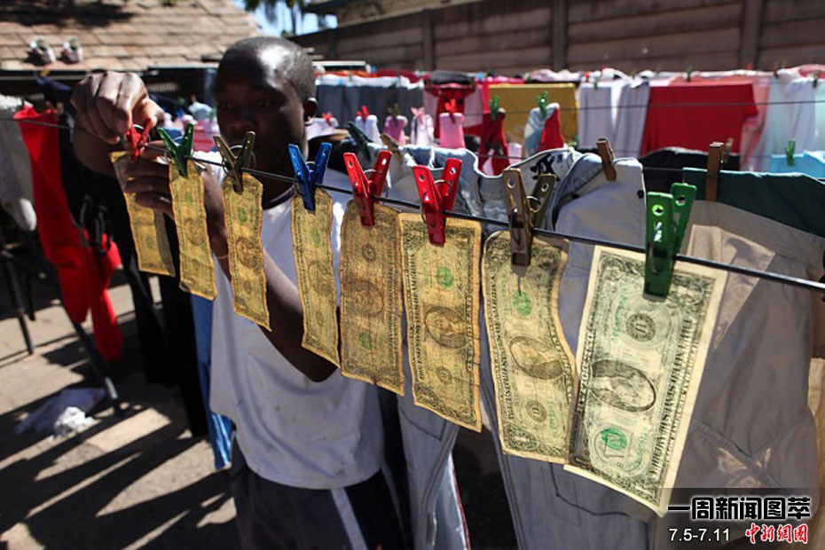 7月6日周二,津巴布韋哈拉雷,阿萊克斯•姆龐迪晾曬清洗過的美鈔。據(jù)當(dāng)?shù)厝苏f,這些美鈔流通到本國時因異味太濃無法使用。去年津巴布韋政府宣布美元為法定貨幣。
