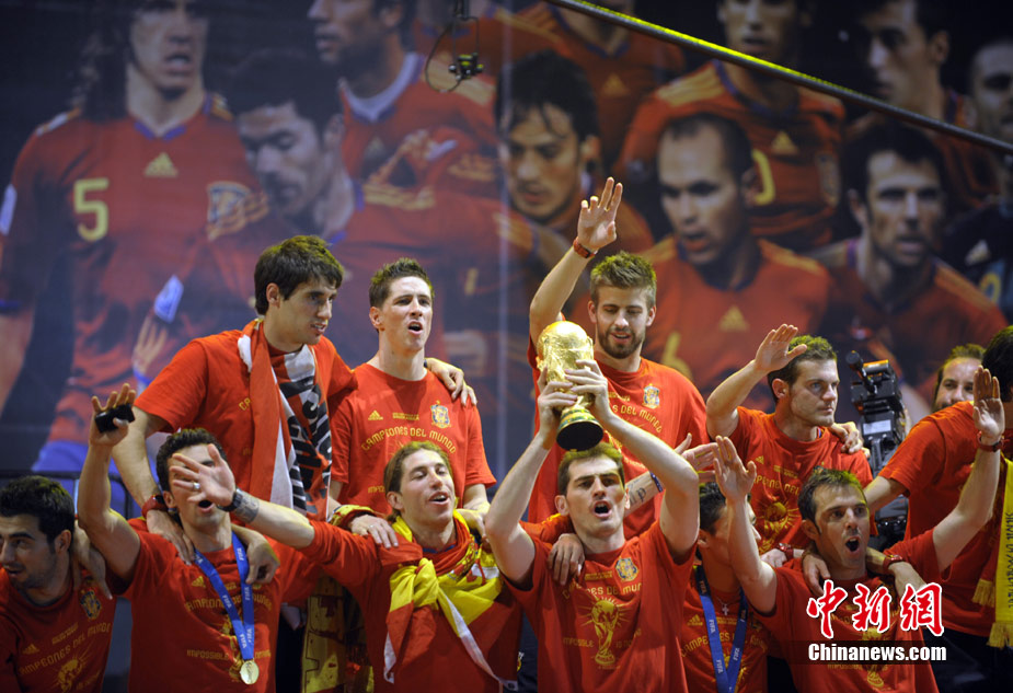 7月12日,在西班牙馬德里,首次奪得世界杯冠軍的西班牙國家隊載譽歸國,并進行奪冠后的游行。