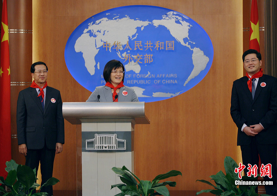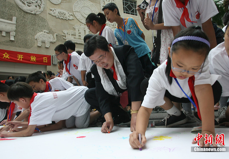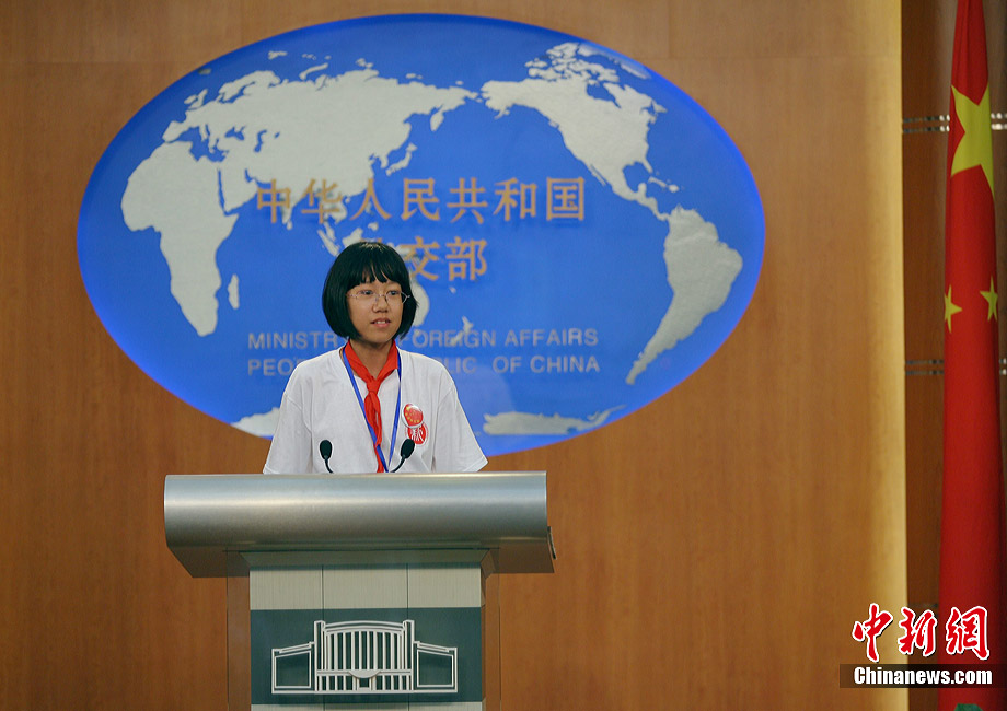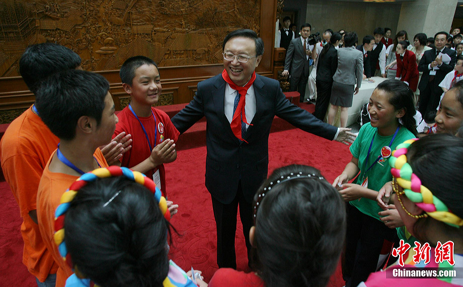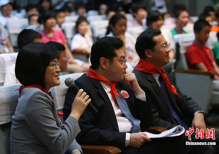 7月17日,在外交部橄欖廳,外交部長楊潔篪勉勵玉樹震區(qū)小學(xué)生努力學(xué)習(xí)、重建家園。當日,外交部舉辦第八次駐外使節(jié)任職宣誓儀式暨外交部“祖國在我心中”主題公眾開放日。來自北京、玉樹、黑龍江、重慶等地的小學(xué)生參加了此次活動。中新社發(fā) 蘇丹 攝