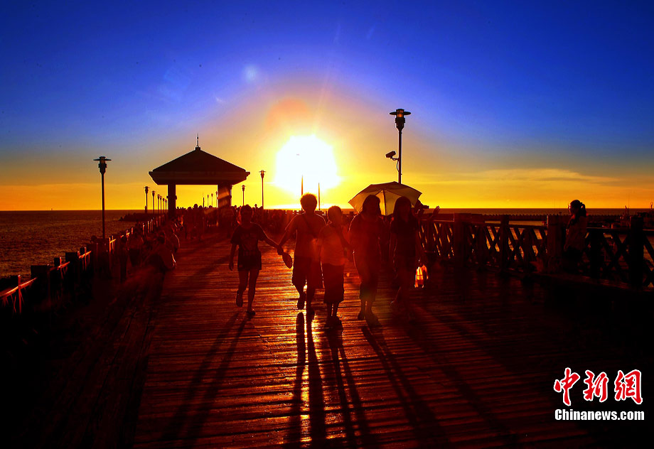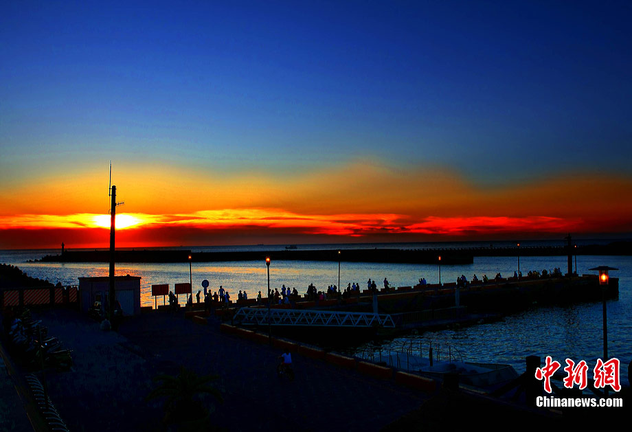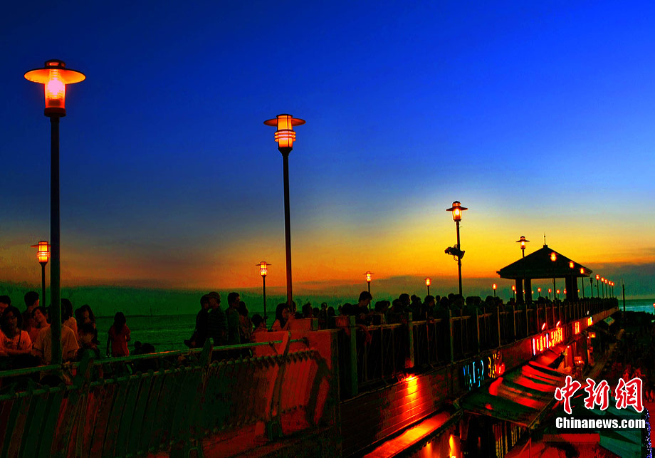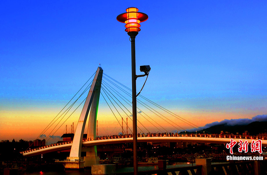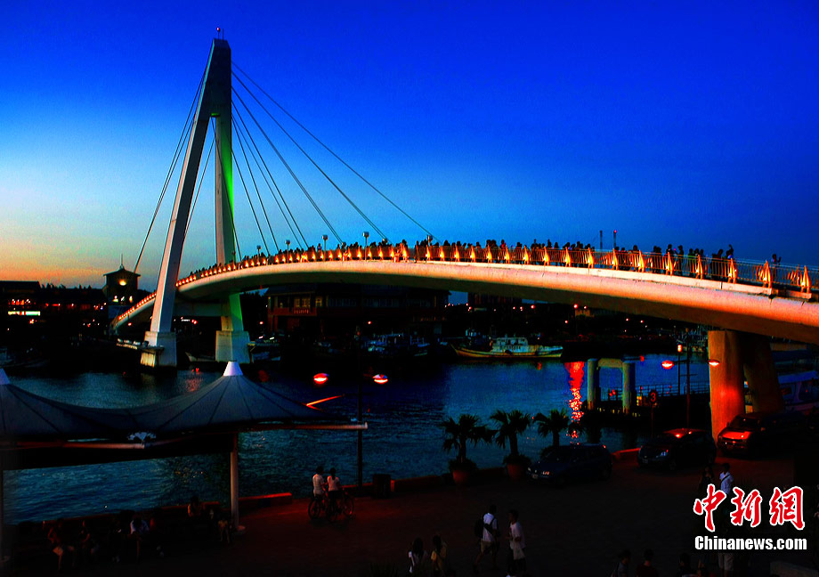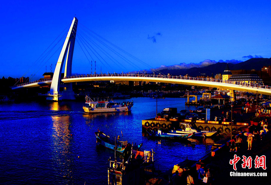 進入7月中下旬的臺灣淡水漁人碼頭,游人如織,黃昏時下,晚霞照碼頭,漁船燈火明,景色迷人。據(jù)悉,淡水漁人碼頭,之前為淡水第二漁港,情人橋完工后,完善成為觀光休閑碼頭。中新社記者 宋吉河 攝