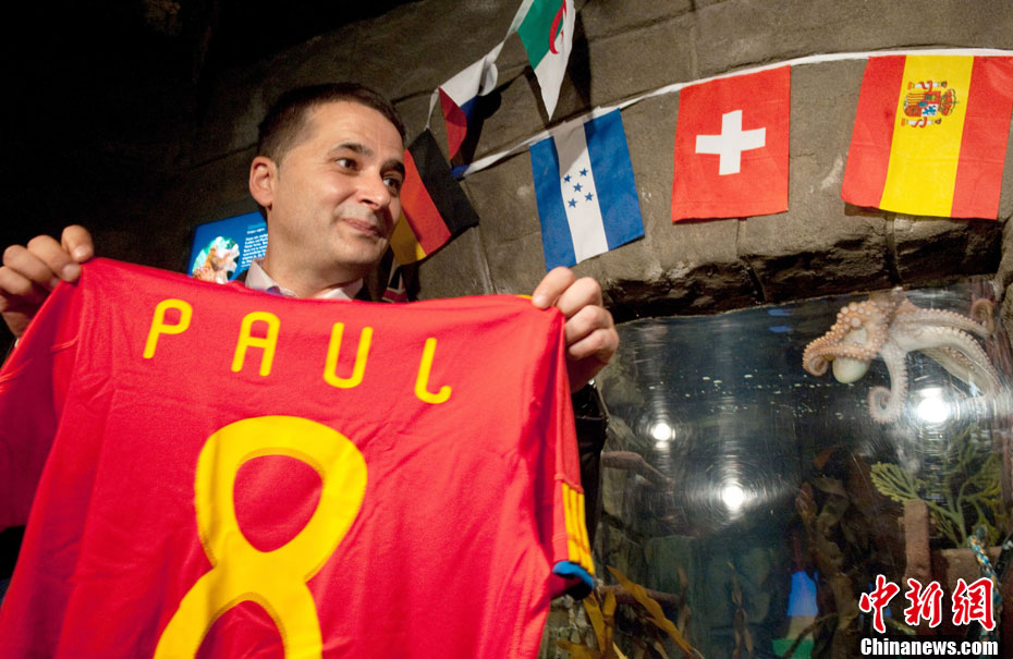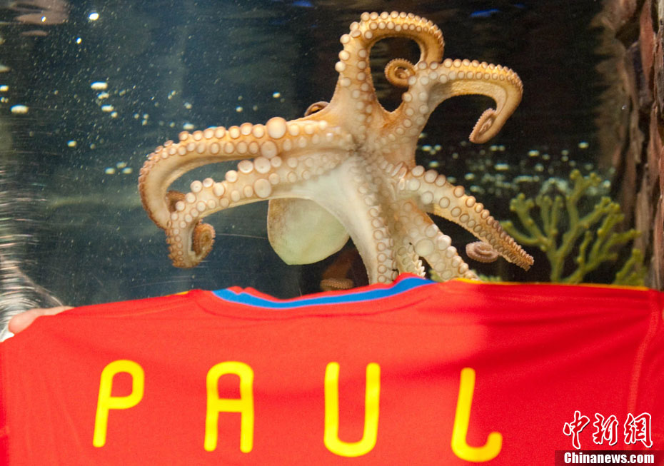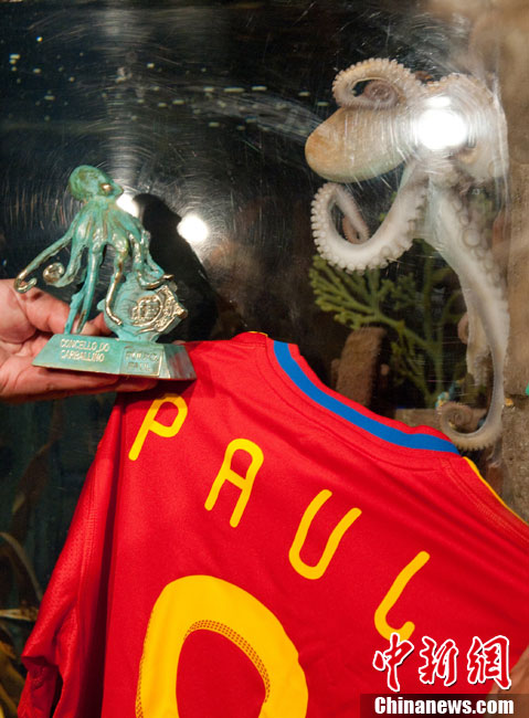 近日,曾在2010年南非世界杯上大放異彩的“章魚哥”保羅再獲殊榮。西班牙卡瓦利諾市市長在德國奧博豪森水族館正式贈(zèng)送給保羅一件印有它名字的西班牙隊(duì)隊(duì)服和保羅自己的青銅像,稱保羅為“城市最好的朋友”。