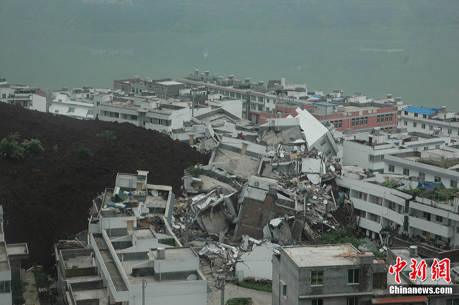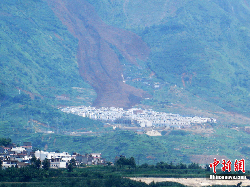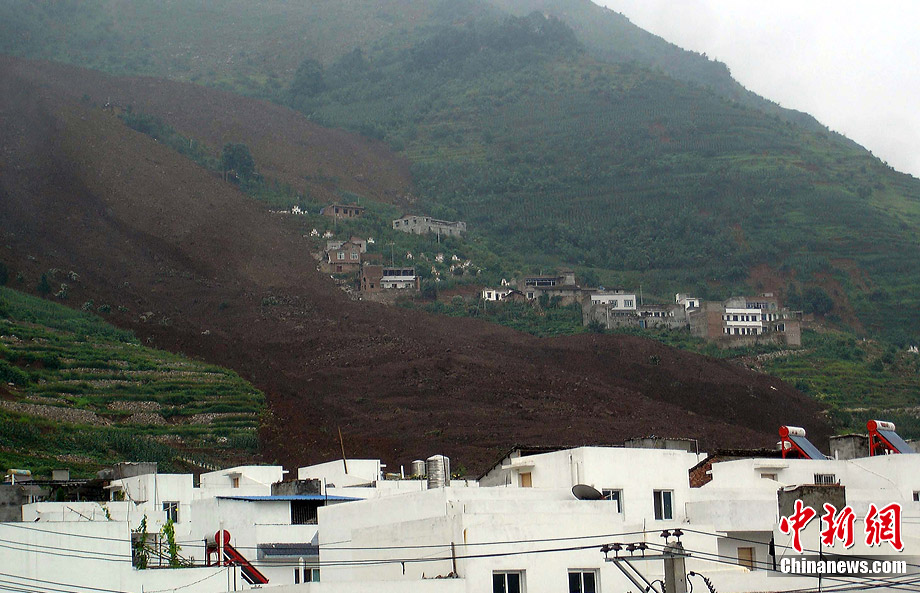 7月27日凌晨5時許,因連日來的持續(xù)強降雨和暴晴天氣,四川雅安市漢源縣萬工鄉(xiāng)雙合村一組萬工集鎮(zhèn)后背山(小地名二蠻山)突發(fā)滑坡,方量約10萬方,造成萬工集鎮(zhèn)、雙合一組部分村民房屋垮塌。初步核實共有58戶房屋受損、21人失蹤。初步勘明強降雨形成的新滑坡推移引發(fā)泥石流,方量約10萬方。由于垮滑現場實施救援較為危險,滑坡暫時被房屋擋住,隨時可能推到房屋再次下滑,救援人員已經全部撤離。災害發(fā)生后,當地迅速調集武警、消防等98人趕赴現場救援,還有230人待命。目前,帳篷、食品、飲用水等救災物資已陸續(xù)運往臨時安置點,尚未發(fā)現新增失蹤人員。圖為山體垮滑現場。中新社發(fā) 孫浩 攝