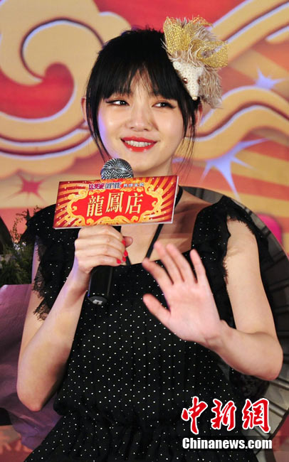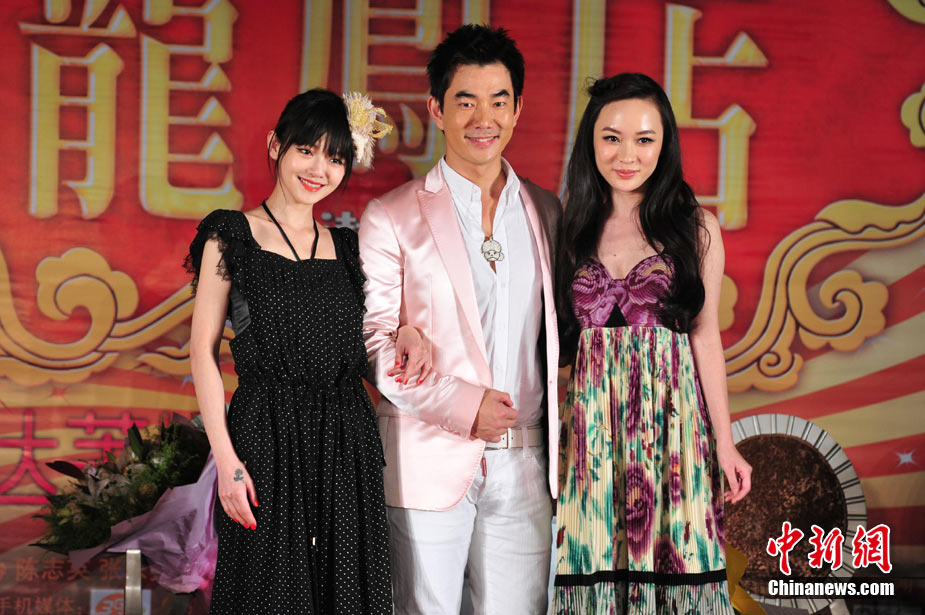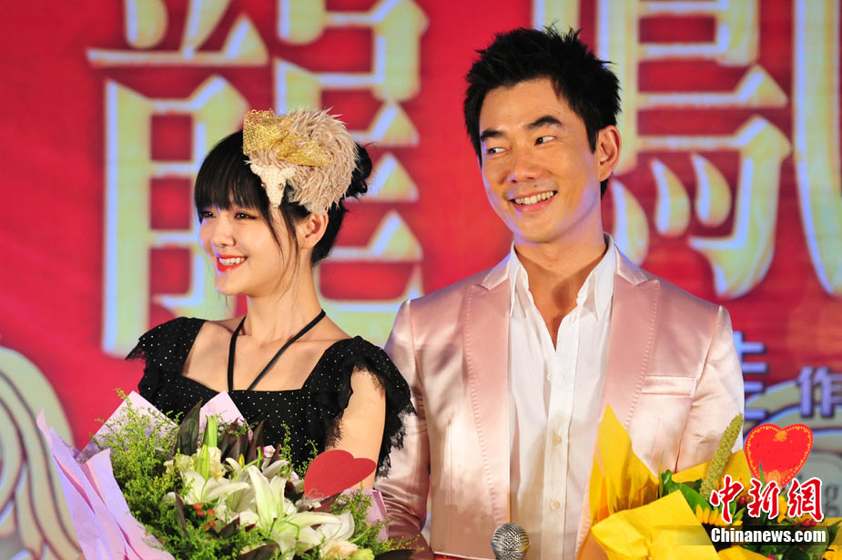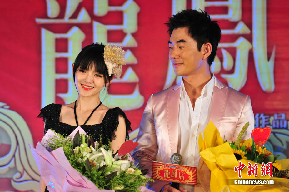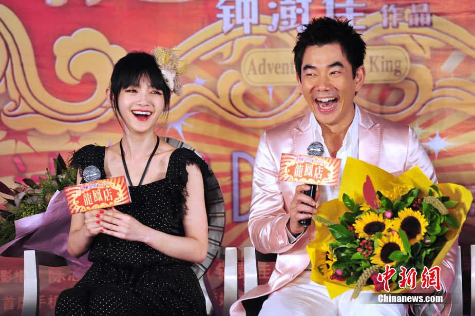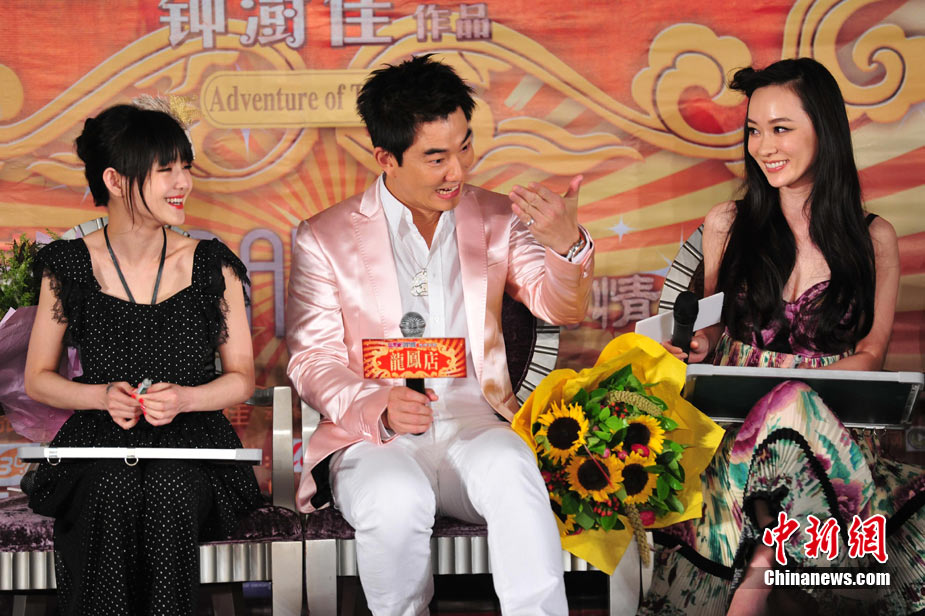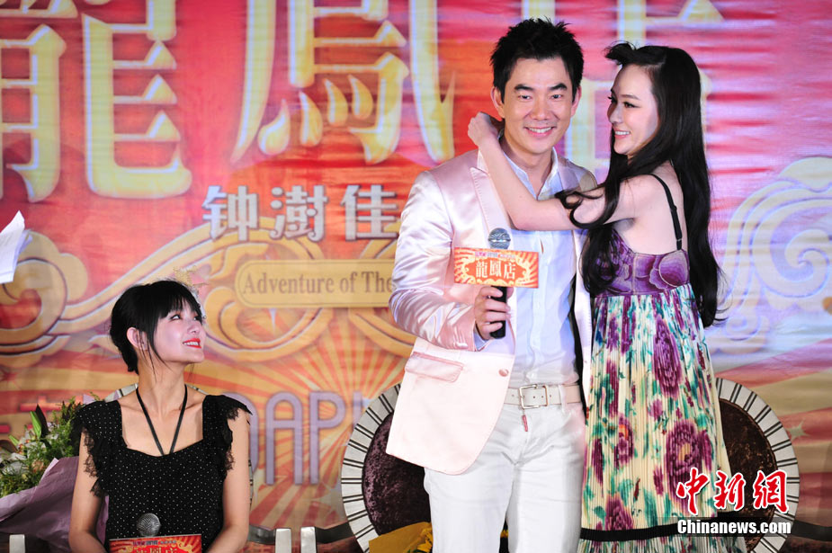 7月30日,古裝愛(ài)情喜劇《龍鳳店》在京舉辦官網(wǎng)啟動(dòng)暨終極海報(bào)揭幕發(fā)布會(huì),導(dǎo)演鐘澍佳攜主演任賢齊、大S、霍思燕亮相,臺(tái)灣著名音樂(lè)人小蟲(chóng)前來(lái)助陣。大S頭戴“刺猬”發(fā)卡可愛(ài)亮相,與任賢齊在現(xiàn)場(chǎng)大談對(duì)唱《龍鳳店》主題曲的感受,大S笑稱(chēng)唱歌比小S好聽(tīng)。后來(lái)登臺(tái)的霍思燕卻大搶大S風(fēng)頭,她為任賢齊親手戴上禮物項(xiàng)鏈,還親密擁抱久久對(duì)視,兩人在現(xiàn)場(chǎng)大秀親昵立刻成為眾人矚目焦點(diǎn),讓大S在一旁有點(diǎn)沒(méi)事做。中新社記者 李學(xué)仕攝