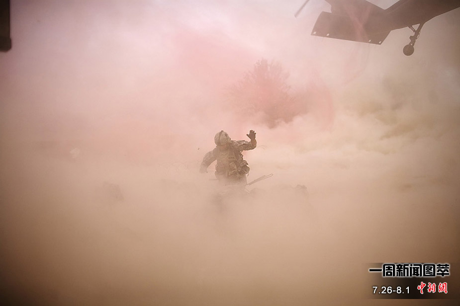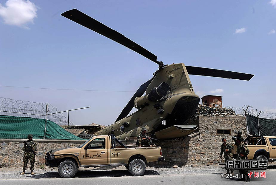7月26日(周一),駐阿富汗國際安全援助部隊的一架“支奴干”直升機在喀布爾東部地區(qū)墜毀。圖為阿富汗國民軍士兵們正守在墜毀的直升機旁。機上四名成員只受了輕傷,飛機墜毀的原因正在調(diào)查中。