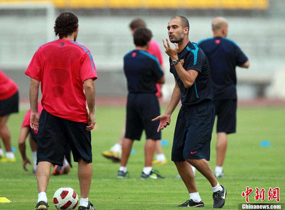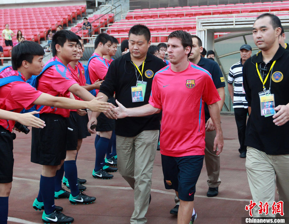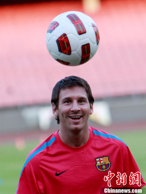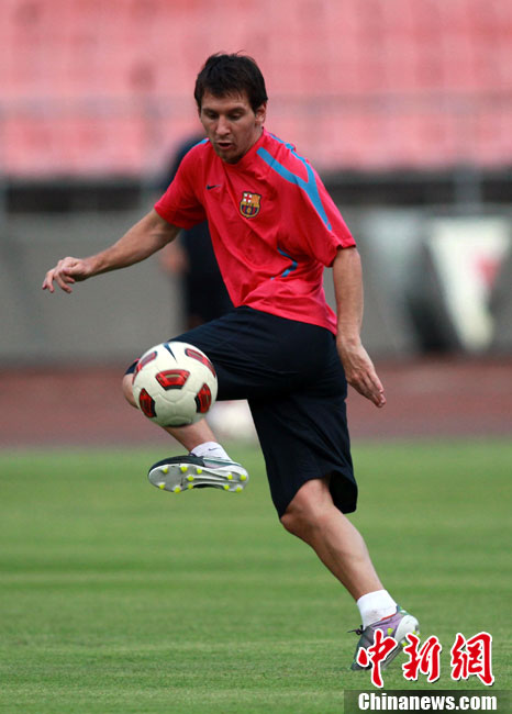 8月6日,巴塞羅那俱樂部在北京工人體育館進行了第二次公開訓練課,眾多巴薩球迷也在現(xiàn)場目睹了球隊風采。圖為梅西出場表情輕松。中新社發(fā) 杜洋 攝