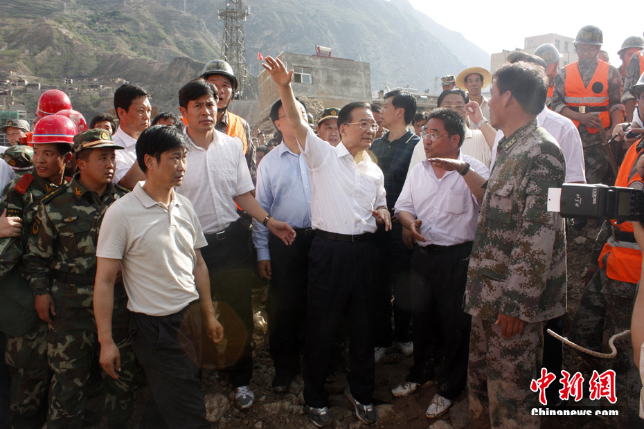 8月8日凌晨,溫家寶總理下午5點左右已抵達甘肅舟曲三眼村救災(zāi)現(xiàn)場。 中新社發(fā) 康元彬 攝 圖片來源:cnsphoto