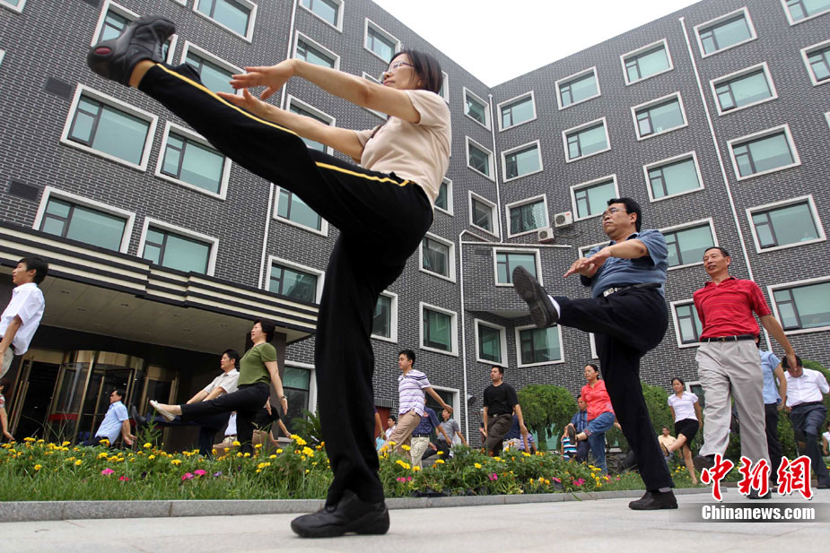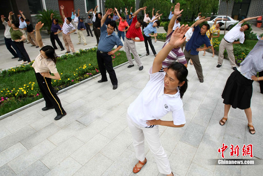 8月9日,北京化工集團(tuán)的職工在工間時段集體做廣播體操。當(dāng)日,北京恢復(fù)廣播體操,電臺在每天10時和15時連續(xù)播放兩次第八套廣播體操音樂,時長為8分鐘左右。此次,北京市總工會定下目標(biāo),2011年全市職工參與健身活動比例要達(dá)到60%以上,國有企業(yè)參與工間或工前操活動要達(dá)到100%,機(jī)關(guān)事業(yè)單位要達(dá)到70%。中新社發(fā) 富田 攝
