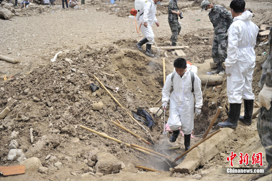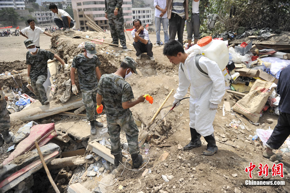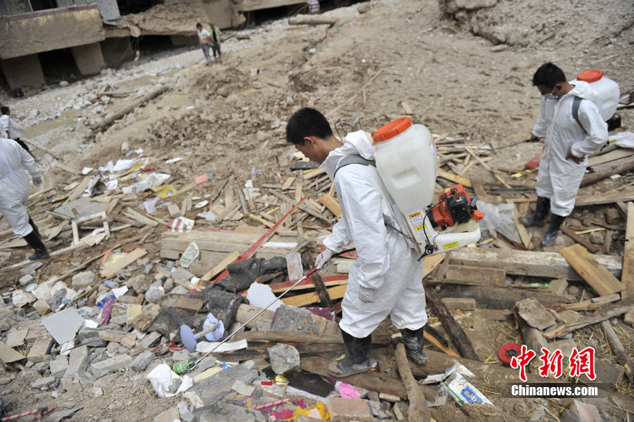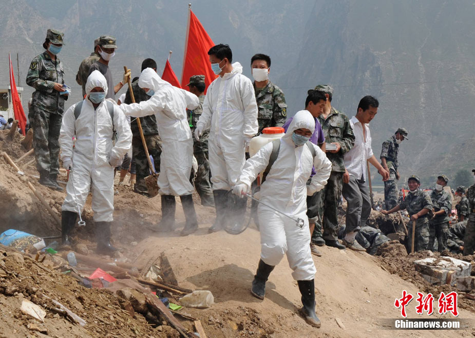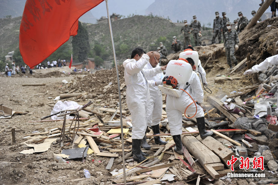 8月10日,甘肅舟曲泥石流災(zāi)區(qū)氣溫超過35攝氏度,醫(yī)療隊(duì)人員在救援現(xiàn)場噴灑消毒劑進(jìn)行防疫消毒。中新網(wǎng)記者 金碩 攝