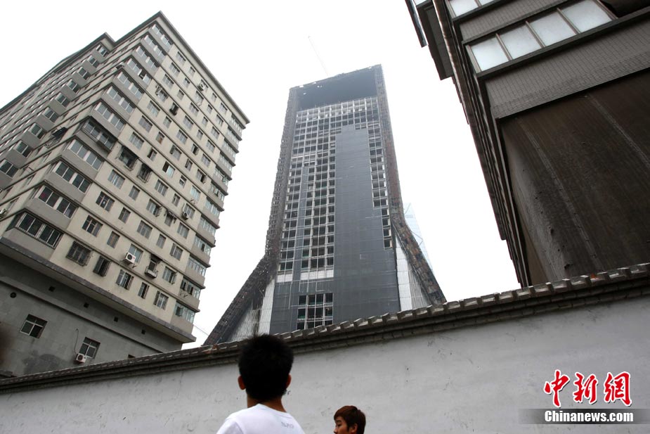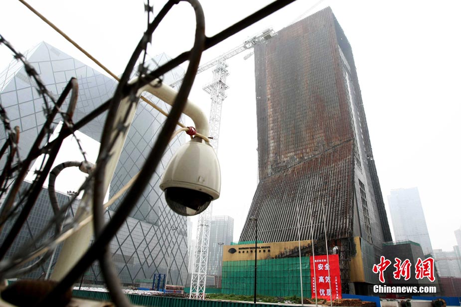8月11日,中央電視臺電視文化中心工程(北配樓)拆卸復(fù)建施工正式啟動。據(jù)了解,當(dāng)日啟動的是金屬幕墻和網(wǎng)架的拆卸。由于主題結(jié)構(gòu)未受到嚴(yán)重影響,因此復(fù)建后的大樓將基本保持“原樣”。這標(biāo)志著2009年2月9日中央電視臺大火一年多后,央視新址北配樓終于正式進(jìn)入拆卸復(fù)建階段。中新社發(fā) 富田 攝