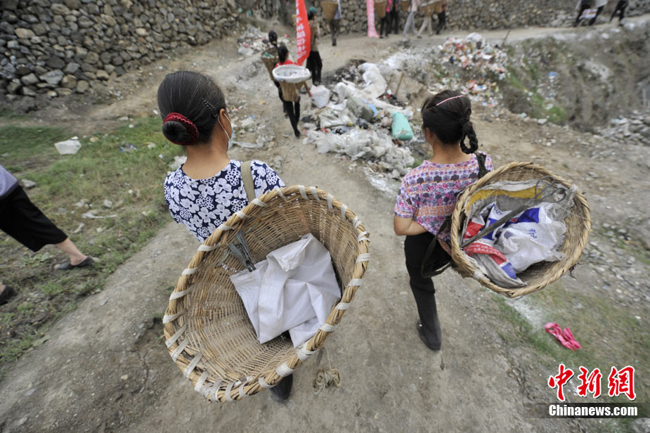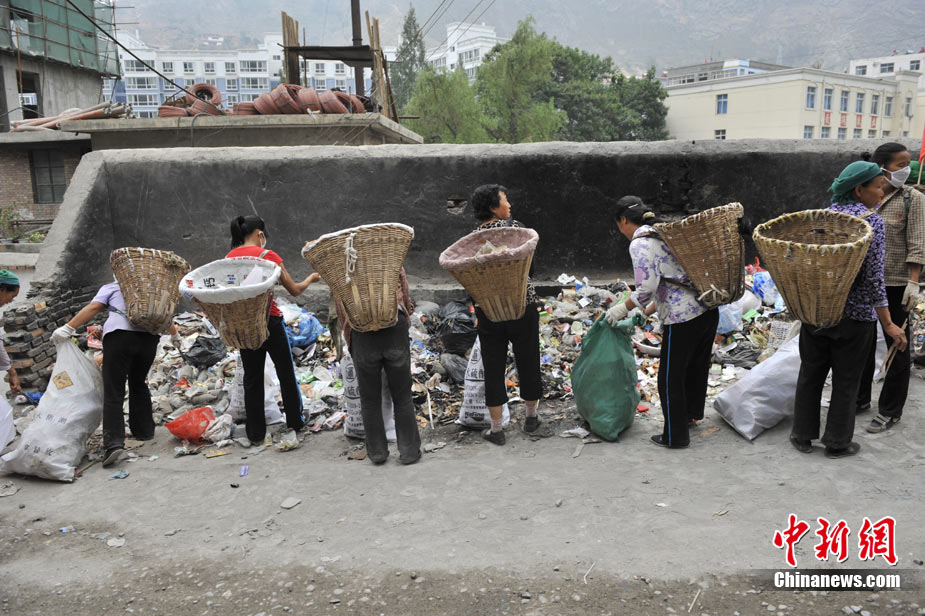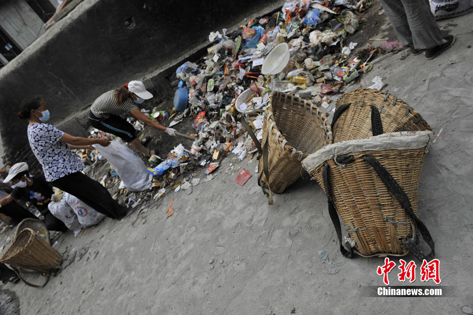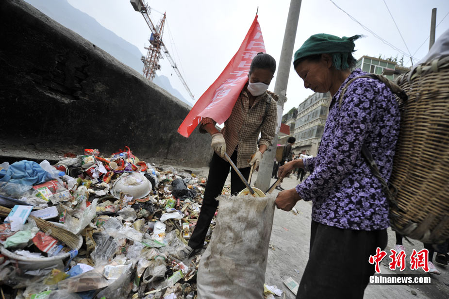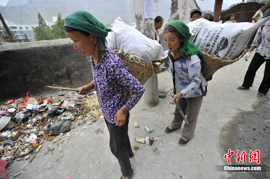 清晨8時(shí)許,舟曲鎖兒頭村的王旻桂和姐妹們來(lái)到城區(qū)。今天,她們的任務(wù)是將城區(qū)的生活垃圾清運(yùn)出去。這是一支“背簍突擊隊(duì)”——“城區(qū)環(huán)境衛(wèi)生清理突擊隊(duì)”的旗幟在王旻桂的背簍上飄揚(yáng)!氨澈t”這種當(dāng)?shù)卮迕裼脕?lái)搬運(yùn)物品的日常工具,在救災(zāi)任務(wù)繁忙、交通不暢時(shí),成為“利器”。