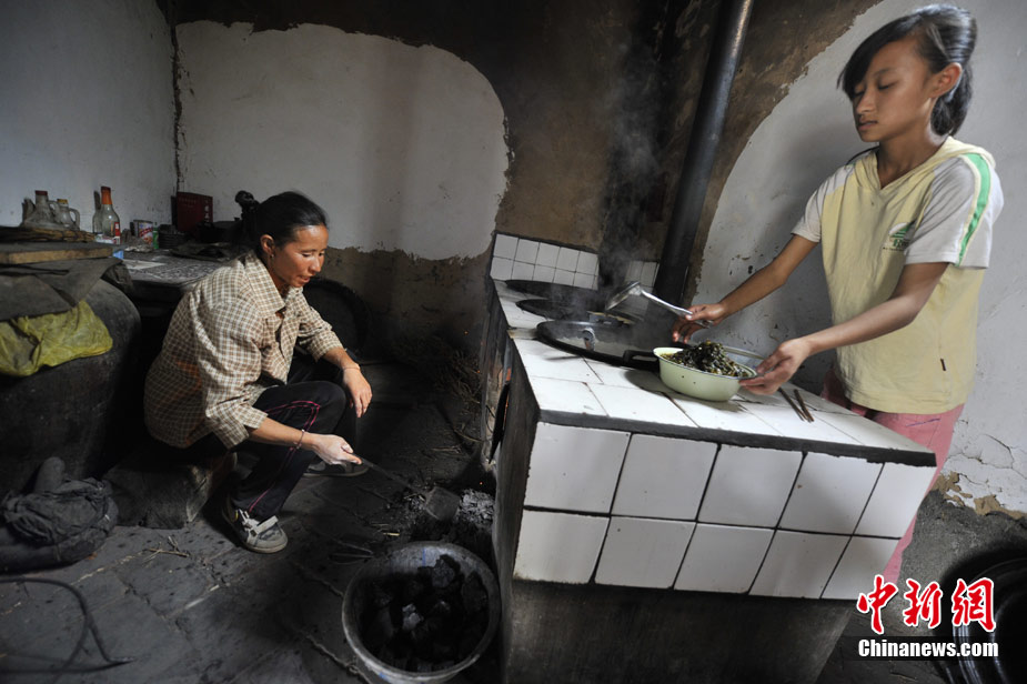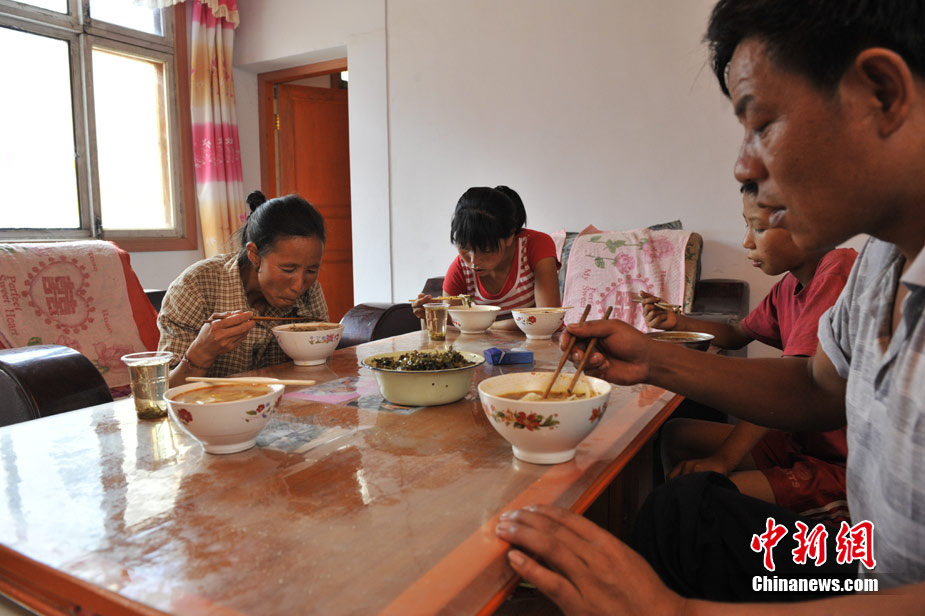 王旻桂的丈夫,因?yàn)樵缟先兔葹?zāi)弄傷了腿,她到家時(shí)飯還沒(méi)做。洗洗手后,王旻桂立即招呼兩個(gè)孩子開(kāi)始準(zhǔn)備午飯,生火、揉面……,不一會(huì),西北特色的湯面片就已經(jīng)上桌。