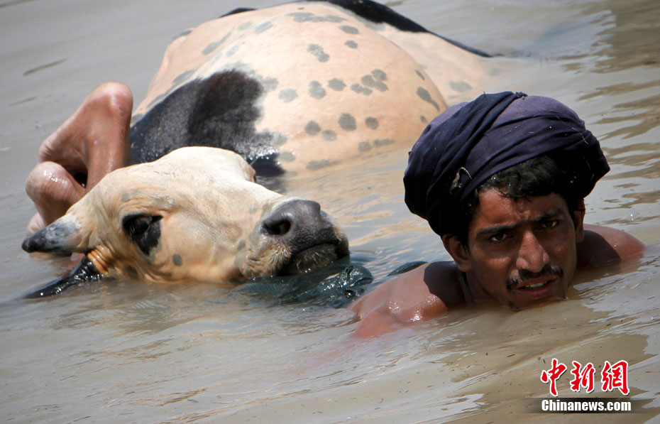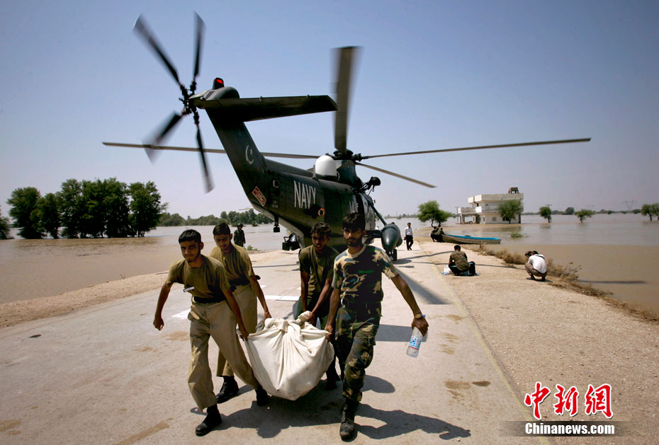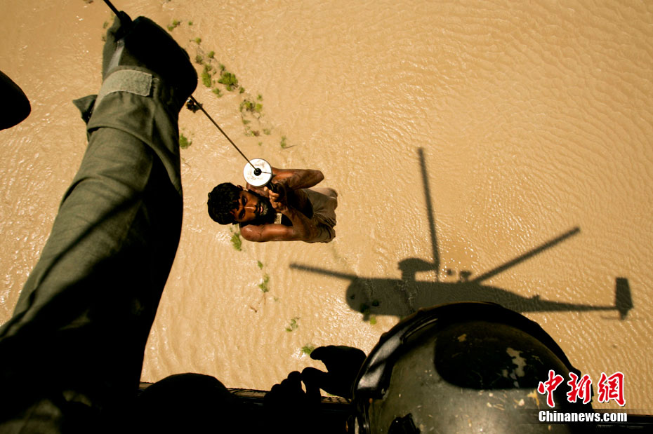 8月11日,巴基斯坦,洪水進(jìn)入信德省中部,一位災(zāi)民被救上直升飛機(jī)。7月下旬以來,巴基斯坦遭遇自1929年以來最嚴(yán)重的洪澇災(zāi)害。據(jù)估計(jì),洪災(zāi)影響到該國從北到南的廣大區(qū)域,已導(dǎo)致1200多人喪生,1400多萬人受到影響。