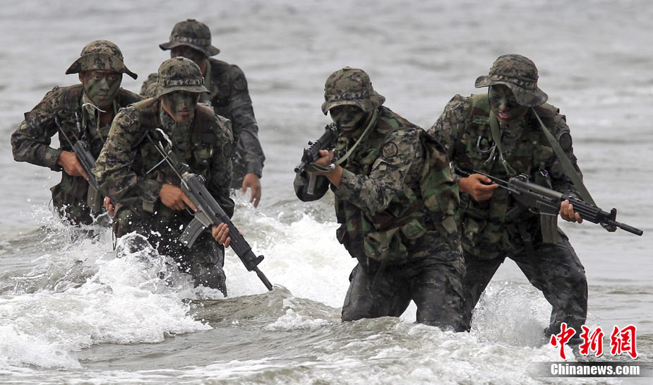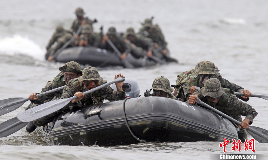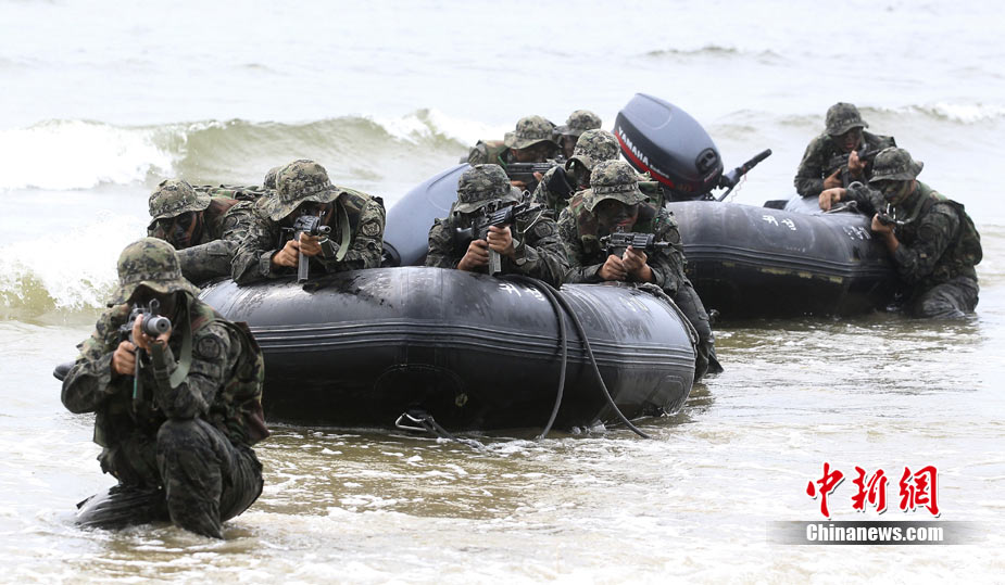 8月12日,韓國泰安郡安眠島,韓國陸軍特種部隊(duì)在海灘上進(jìn)行訓(xùn)練。