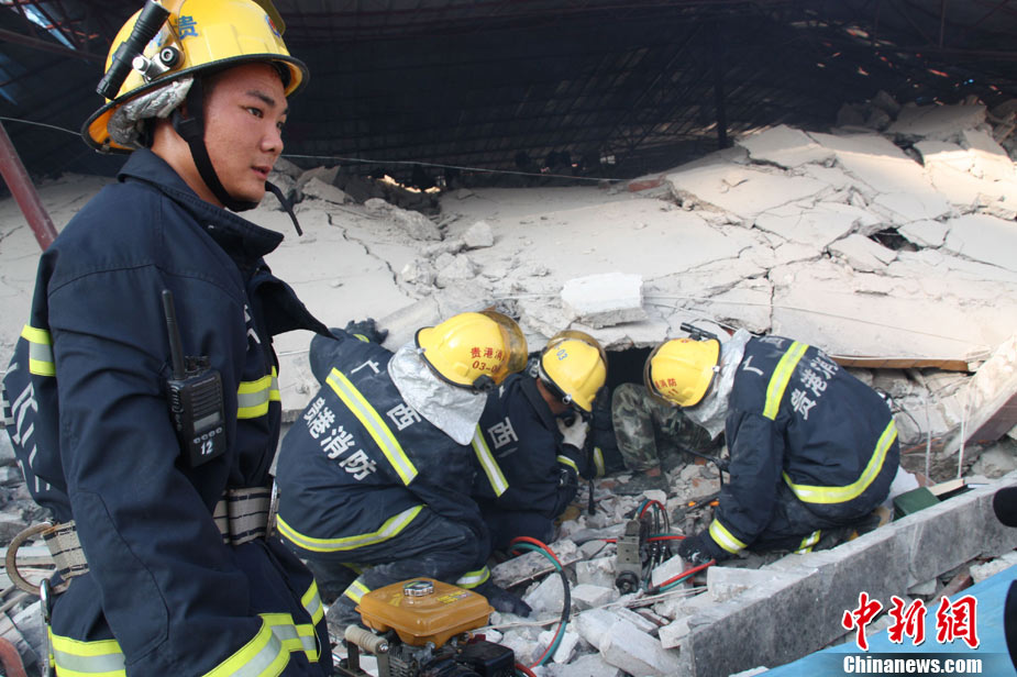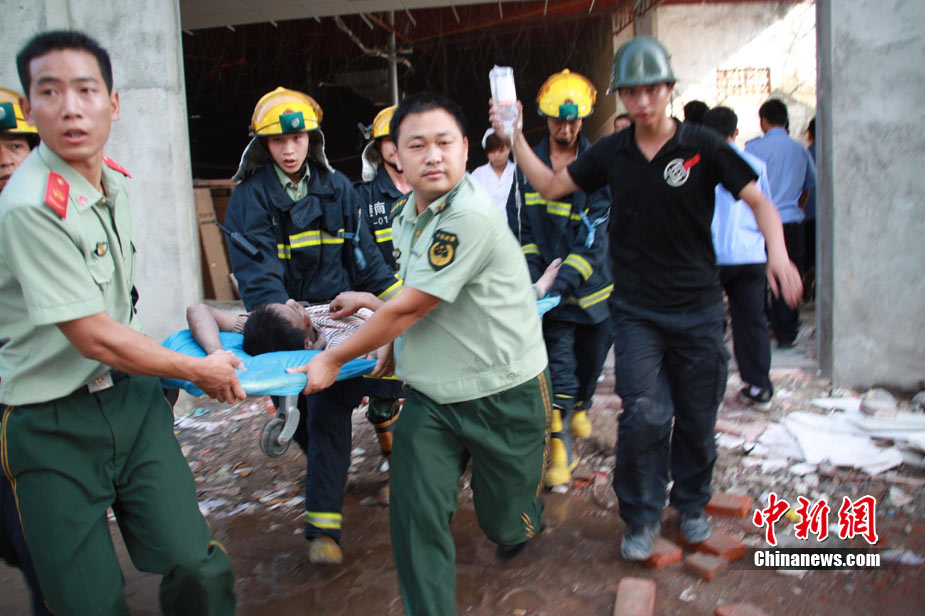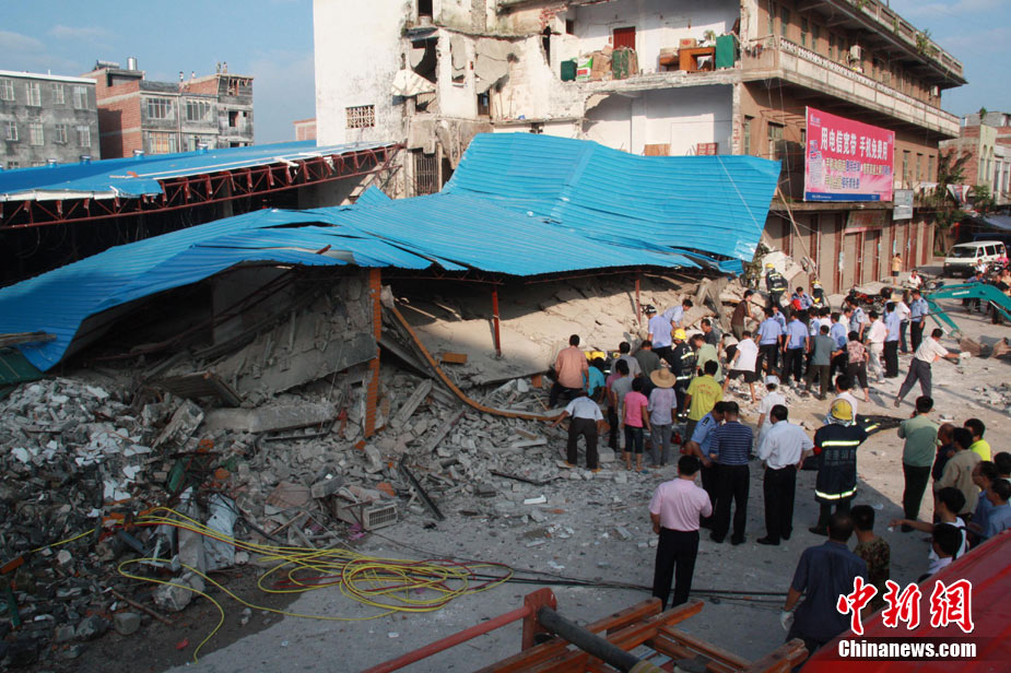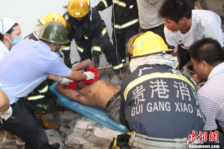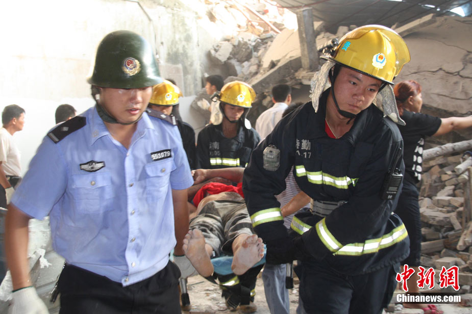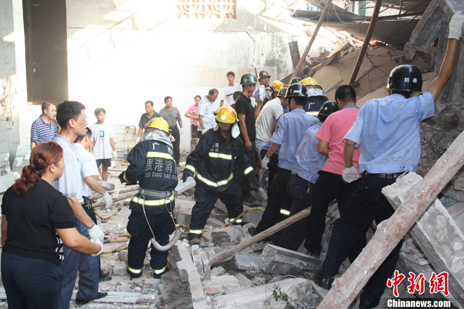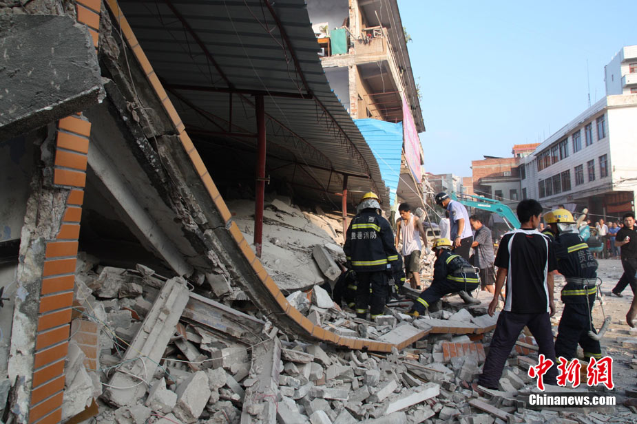 8月13日早晨,廣西貴港市橋圩鎮(zhèn)供銷社百貨門市部一棟3層的樓房突然倒塌,造成12名住戶被埋廢墟中。至上午10時50分,已知被埋人員被消防官兵全部救出,事故造成3人死亡9人受傷。中新社發(fā) 楊文福 攝