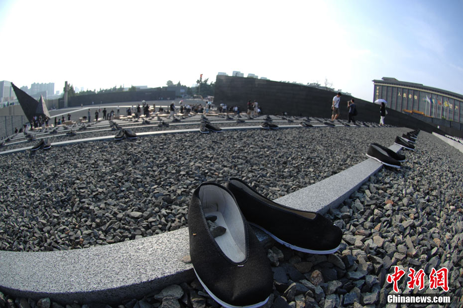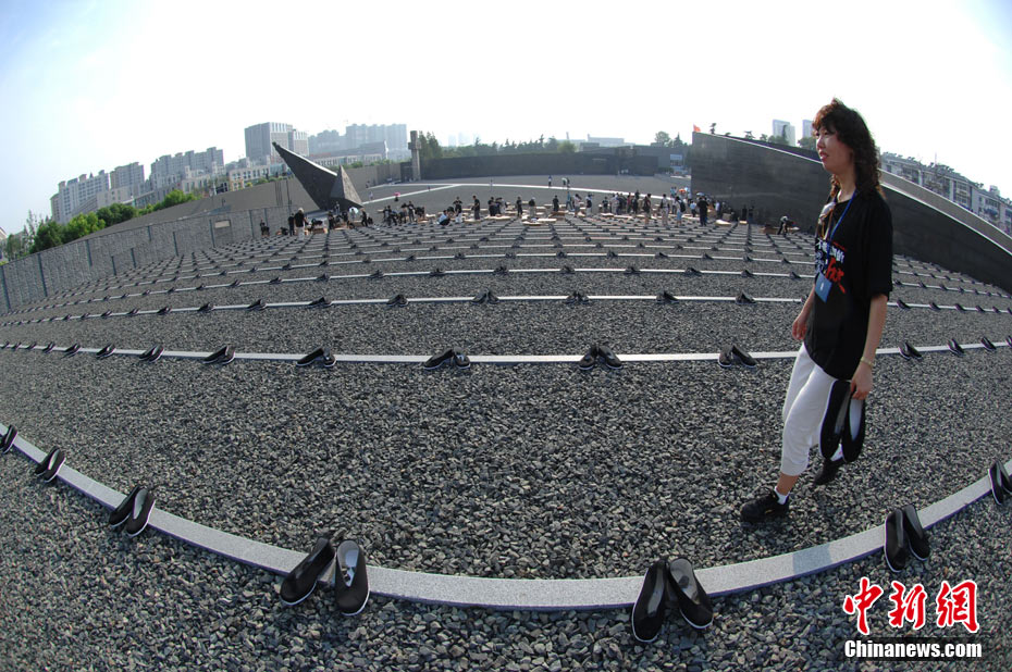 為紀(jì)念二戰(zhàn)期間在日本遇害的6830名被強(qiáng)擄的中國勞工,8月14日下午,在侵華日軍南京大屠殺遇難同胞紀(jì)念館廣場,被擄勞工中的幸存者及遇難者家屬、日本友人等近50人舉行了6830雙布鞋擺放活動(dòng)。中新社發(fā) 江法 攝 圖片來源:cnsphoto