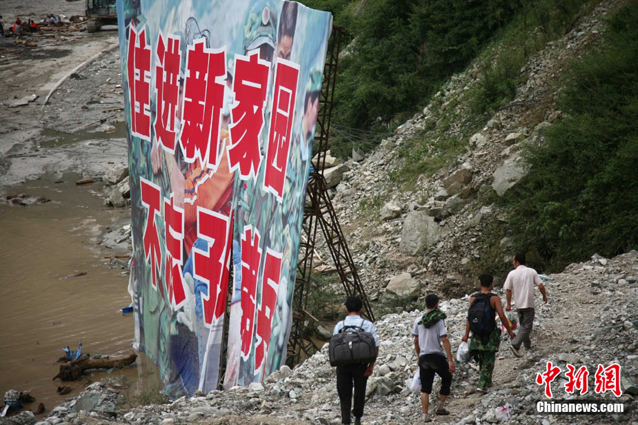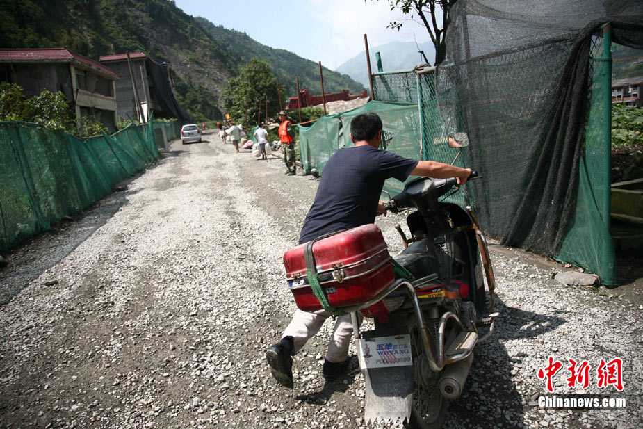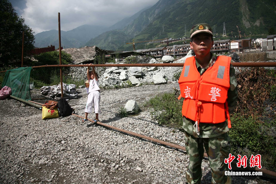 阿壩州汶川境內因近日強降雨而引發(fā)的泥石流阻斷道路、沖毀房屋,泥石流沖出物致使120米寬的岷江河道淤塞,堰塞體平均高度達7米,致使岷江改道。災后重建的映秀新城亦被洪水圍困再次成為“孤島”。8月15日,映秀天空放晴,但堰塞體還未得到根本疏通,映秀新城仍被淹水中,現(xiàn)場搶險指揮人員表示,堰塞體有望15日下午得到疏通。圖為映秀鎮(zhèn)岷江河床上一朵快枯萎的向日葵,背后則是被水淹的重建新房。 中新社發(fā) 張浪 攝
