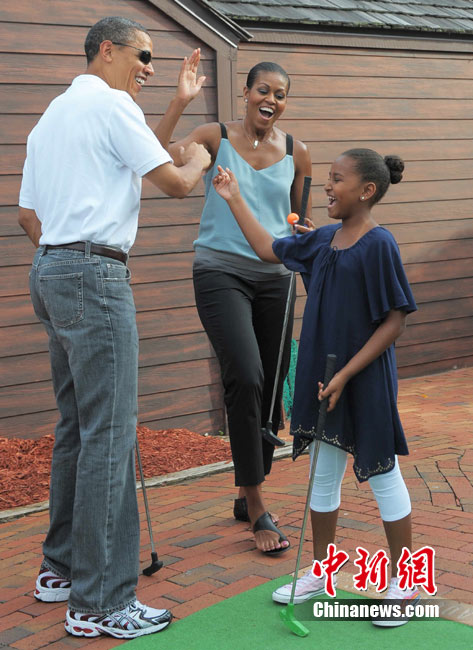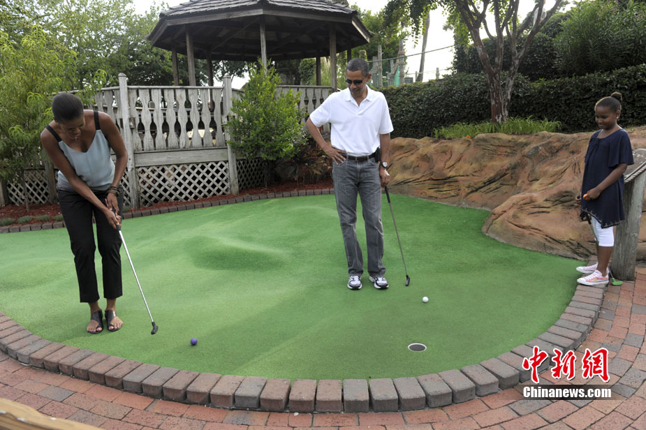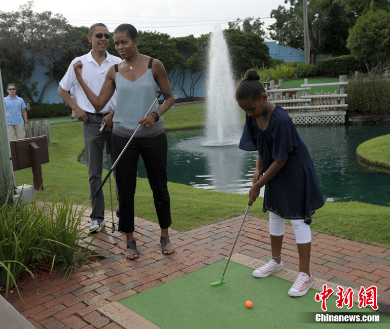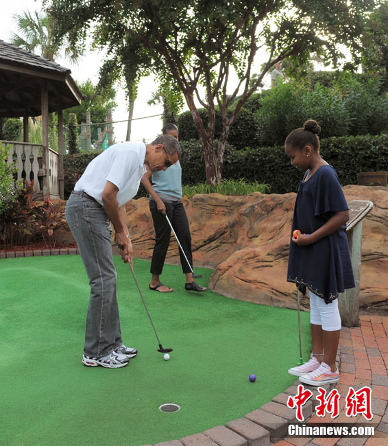 近日,奧巴馬到佛羅里達(dá)巡視墨西哥灣油污清理作業(yè)、推銷當(dāng)?shù)赜^光的機(jī)會(huì)。14日,他帶著妻女到佛羅里達(dá)一個(gè)迷你高爾夫球場(chǎng)散心, 全家一起上陣,小試身手。