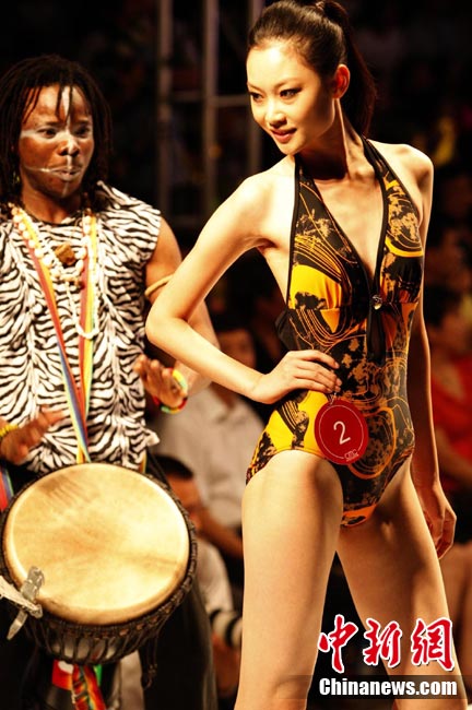 8月14日晚,“星美星感覺”2010中國模特大會結(jié)業(yè)頒獎典禮暨星美之夜時尚PARTY在北京懷柔中國影視界星美小鎮(zhèn)影視基地舉行,大會以全國性模特青年訓(xùn)練營的形式,用名師、明星、名模獨特的視角點撥靈動心智,發(fā)掘未來新星。來自全國15個省、40多個城市的150名模特新星們參加了專業(yè)培訓(xùn)。圖為2010中國模特大會新秀泳裝展示風(fēng)采。中新社發(fā) 錢興強 攝