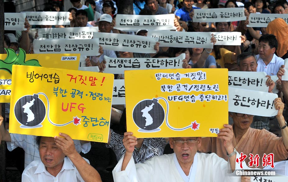 8月15日,在韓國(guó)首都首爾,韓國(guó)民眾在戰(zhàn)爭(zhēng)紀(jì)念館前集會(huì),反對(duì)韓國(guó)與美國(guó)舉行代號(hào)為“乙支自由衛(wèi)士”的聯(lián)合軍演。