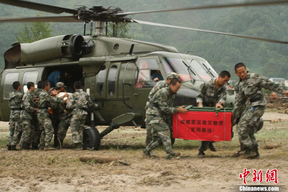 被中央軍委授予“抗震救災(zāi)英雄陸航團(tuán)”榮譽(yù)稱號(hào)的成都軍區(qū)某陸航團(tuán),在綿竹清平鄉(xiāng)“8.13”特大山洪泥石流災(zāi)害發(fā)生后,連日來奮戰(zhàn)于災(zāi)區(qū),為清平架起“生命線”,承擔(dān)起為災(zāi)區(qū)運(yùn)送各類救援人員,轉(zhuǎn)運(yùn)災(zāi)區(qū)群眾,運(yùn)輸救災(zāi)物資等任務(wù)。 圖為陸航團(tuán)直升機(jī)為災(zāi)區(qū)空運(yùn)來急需的重型機(jī)械設(shè)備所需油料。中新社發(fā) 高樂暢 攝