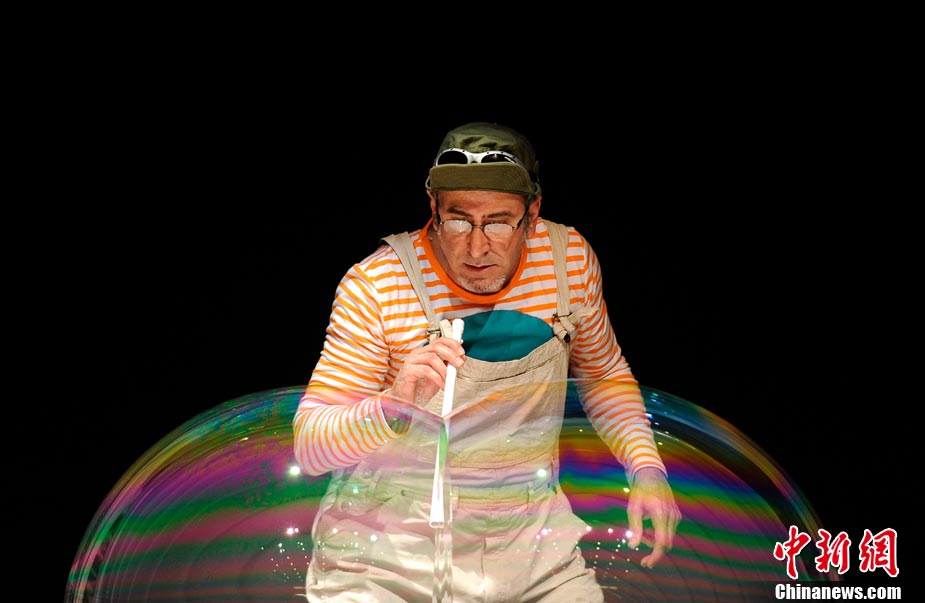 當(dāng)?shù)貢r(shí)間8月18日,西班牙馬德里,藝術(shù)家 Luis Bevia在舞臺(tái)上大!胺试砼菽g(shù)”。