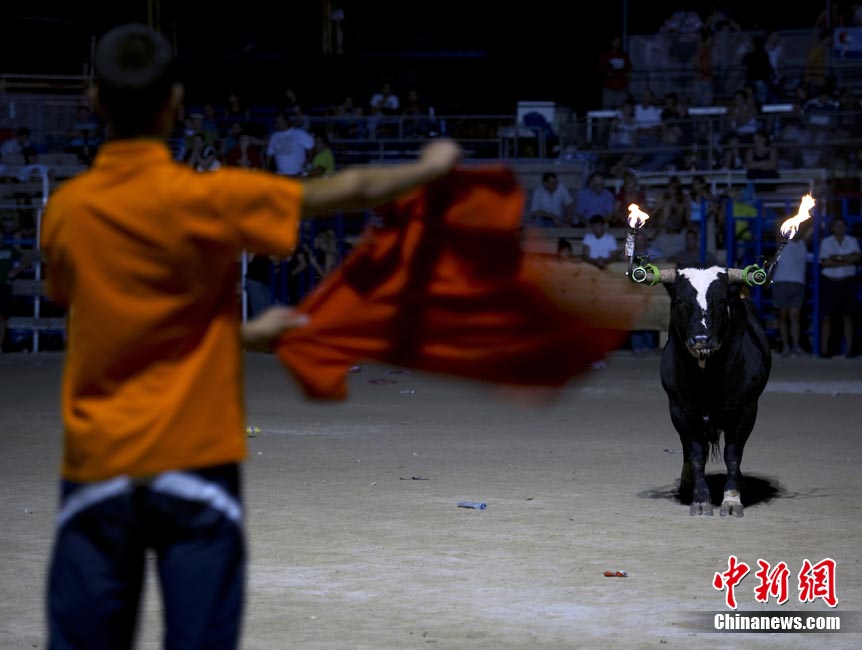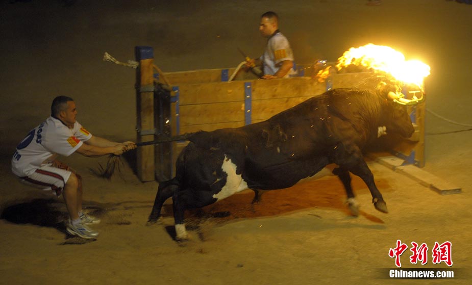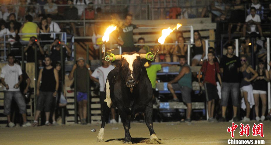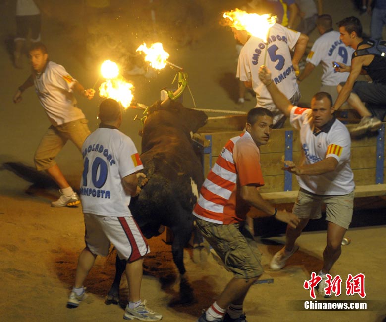 近日,在西班牙安波斯塔市,舉行“奔火牛”活動(dòng)。“奔火!笔俏靼嘌罇|部地區(qū)的傳統(tǒng)節(jié)日慶典活動(dòng)。在活動(dòng)中,公牛的犄角被綁上火把滿場(chǎng)飛奔,場(chǎng)面驚險(xiǎn)刺激。
