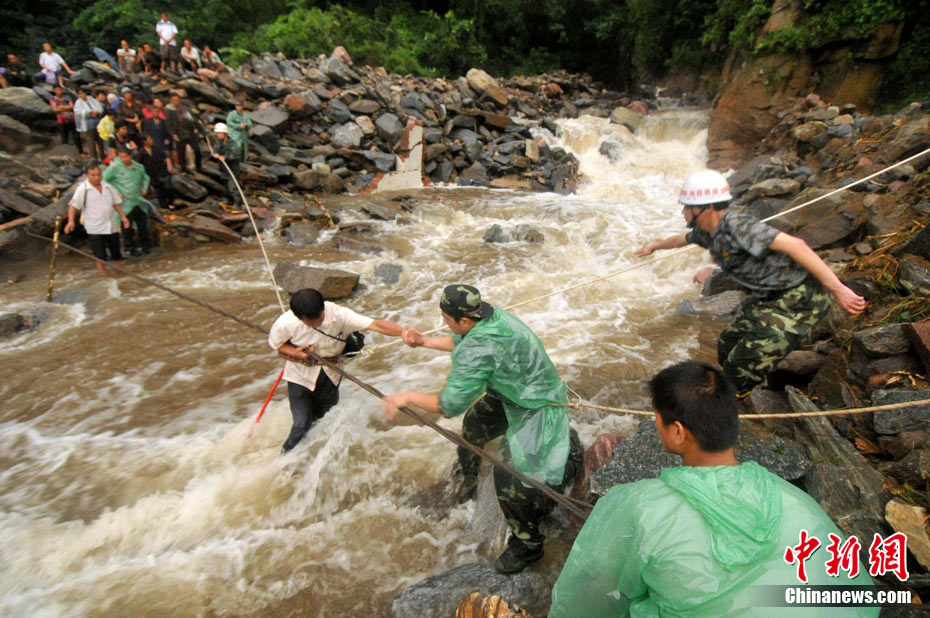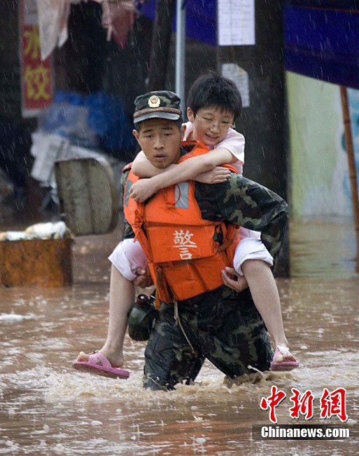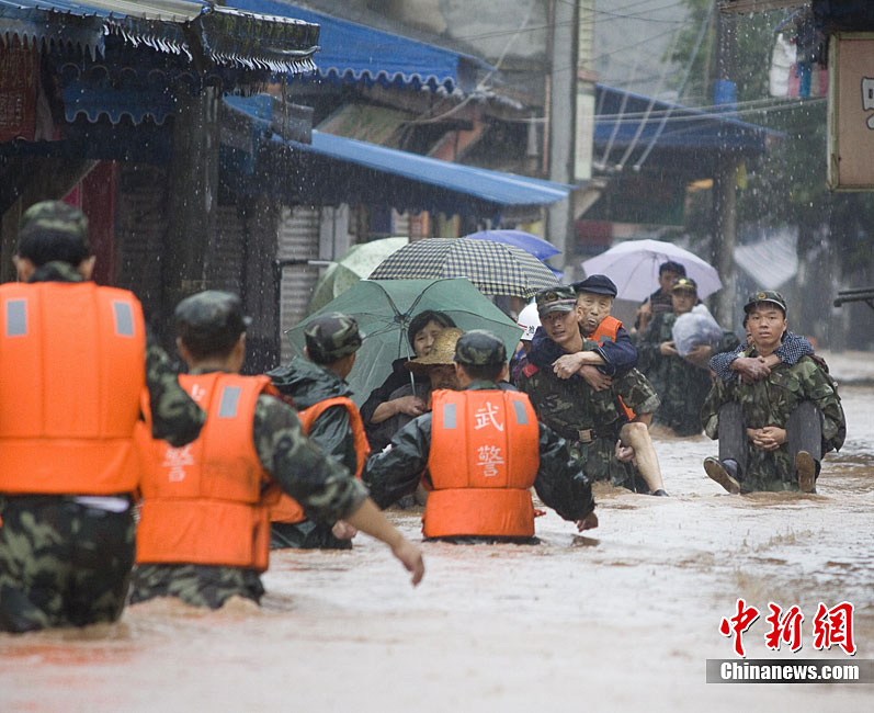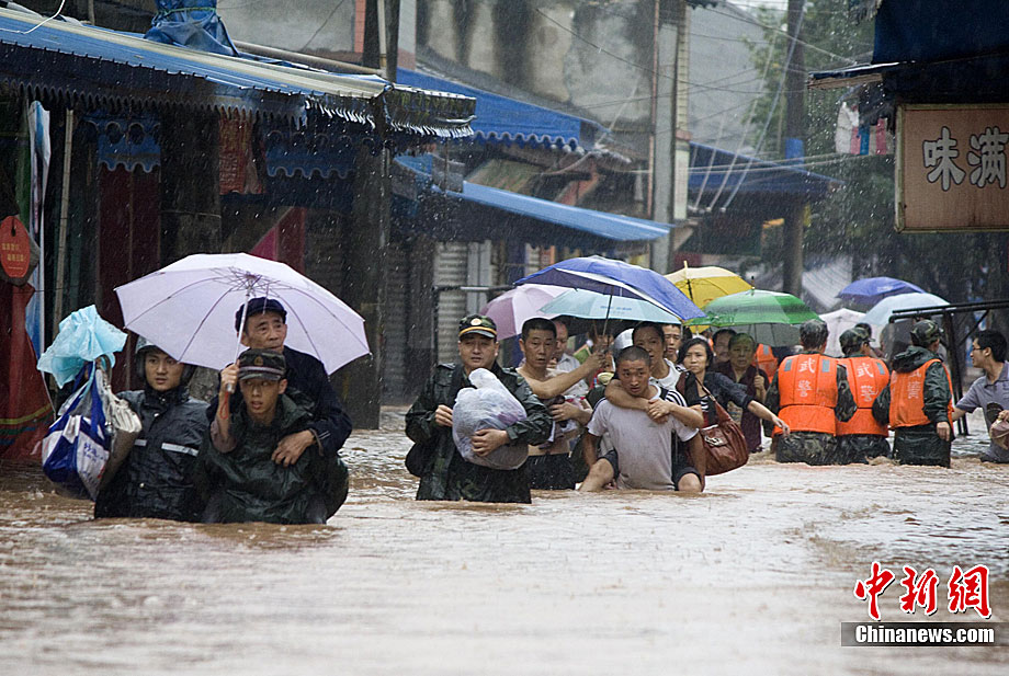 8月19日,四川眉山市東坡區(qū)修文、三蘇、萬勝等鄉(xiāng)鎮(zhèn)遭遇特大洪水襲擊,造成部分鄉(xiāng)鎮(zhèn)街道進(jìn)水,民房被淹,民眾被困。當(dāng)?shù)卣、武警、消防、民兵預(yù)備役官兵成功轉(zhuǎn)移5000多民眾。圖為武警官兵洪水中轉(zhuǎn)移受困民眾。中新社發(fā) 古良駒 攝