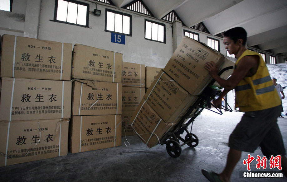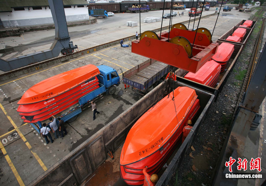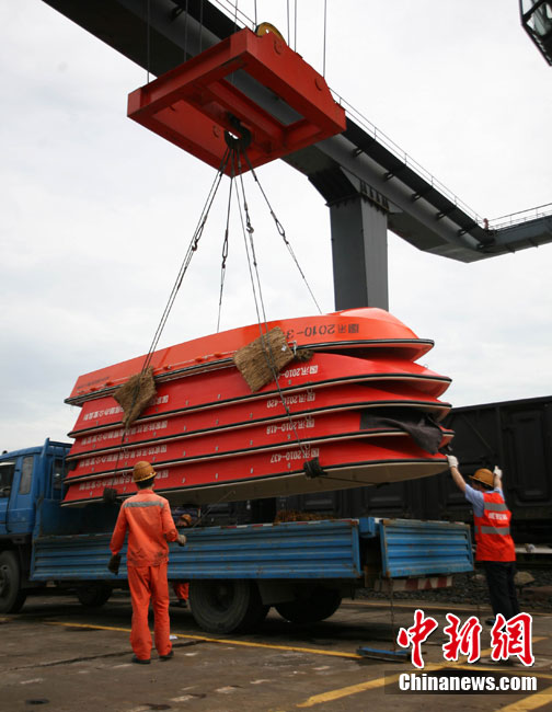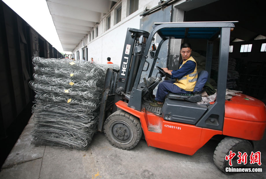 8月21日上午,國家防總緊急調撥的80艘沖鋒舟,40支橡皮舟、120臺船外機、1萬件救生衣、4000片鉛絲籠網片、4000個鋼絲網兜、500盞查險燈等搶險救災物資順利抵達成都火車東站,將立刻分發(fā)運往成都、眉山、樂山、巴中等災情嚴重地區(qū)。圖為裝卸工人正在吊裝沖鋒舟。中新社發(fā) 劉忠俊 攝