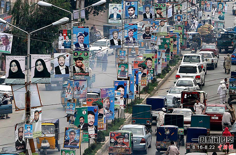 周一(16日),阿富汗城市賈拉拉巴德的街道上布滿議員競選的海報。阿富汗將于9月份舉行議會選舉。