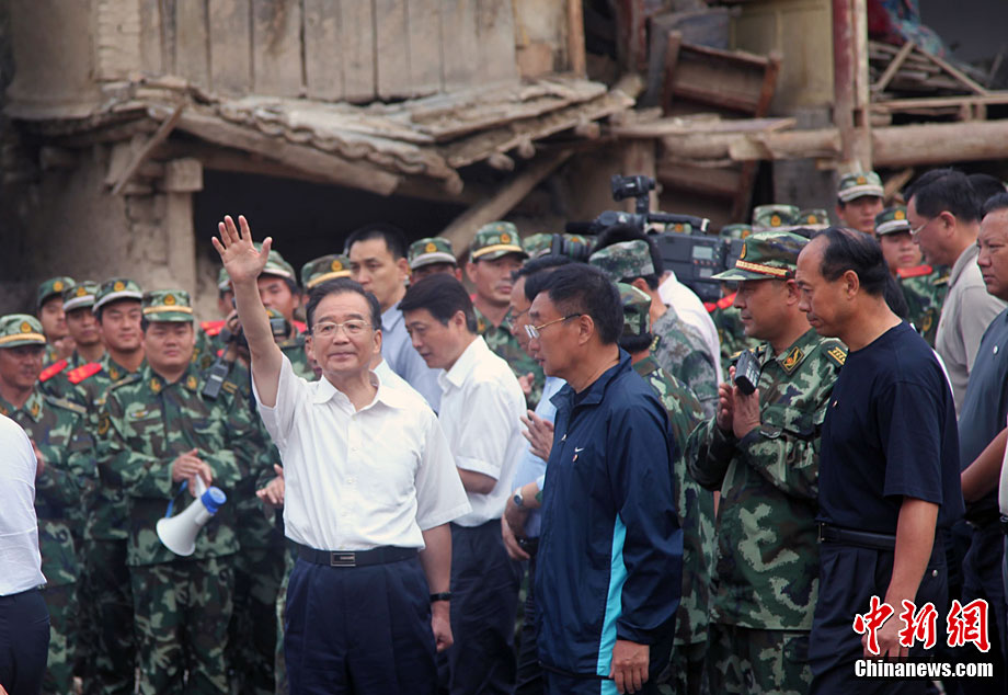 8月22日上午,中國(guó)國(guó)務(wù)院總理溫家寶第二次來(lái)到甘肅舟曲災(zāi)區(qū),看望舟曲特大泥石流災(zāi)害中受災(zāi)的群眾。中新社發(fā) 龐紅升 攝