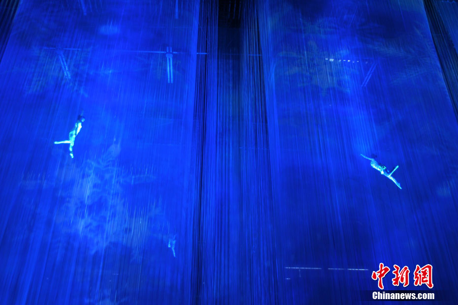 8月23日,北京武搏會開幕式彩排中,演員在由12.5萬根筷子粗細(xì)的腈綸線組成的“線陣”中表演。據(jù)了解,這是國內(nèi)首次使用“線陣”作為開幕式創(chuàng)意。 中新社發(fā) 蘇丹 攝