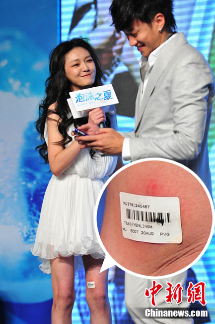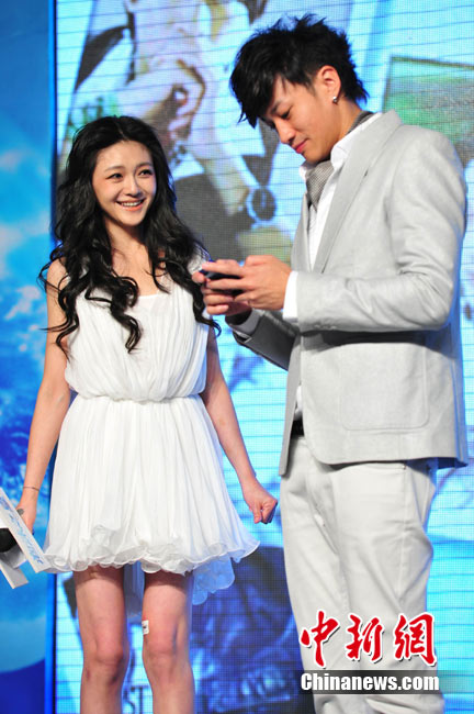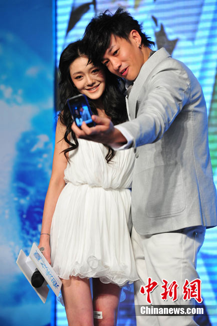 8月25日,偶像劇《泡沫之夏》在北京舉行了開(kāi)播發(fā)布會(huì),主演大S與何潤(rùn)東出席。時(shí)尚女王大S浪漫卷發(fā)和夢(mèng)幻白裙造型似童話中的公主,與“夢(mèng)幻泡沫 浪漫之夏”的主題十分貼合。何潤(rùn)東也默契地以西裝出席,兩人十分登對(duì);顒(dòng)中,這對(duì)不斷傳出緋聞的熒屏最佳搭檔不僅毫不避嫌地互相夸獎(jiǎng),何潤(rùn)東還當(dāng)眾與大S頻頻用手機(jī)自拍親密合影停不下來(lái),還現(xiàn)場(chǎng)將自拍照上載至微博。中新社記者 李學(xué)仕 攝