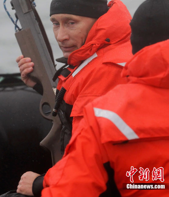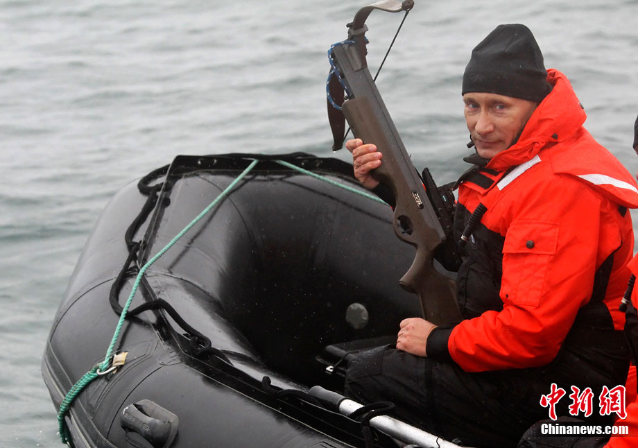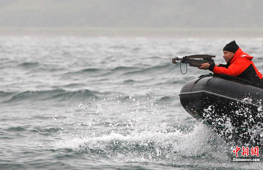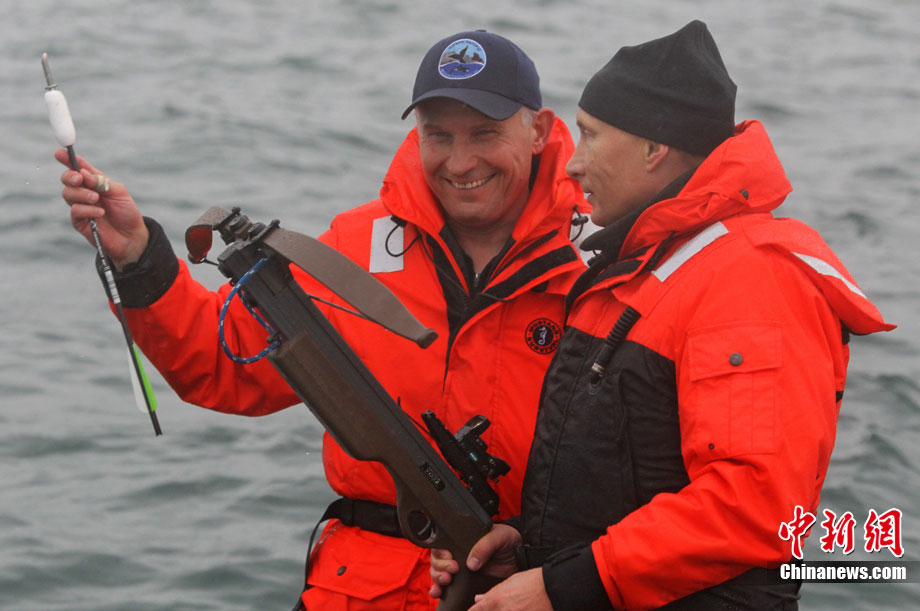 當(dāng)?shù)貢r(shí)間8月25日,俄羅斯總理普京在勘察加半島附近的奧爾加港參與科學(xué)考察時(shí),乘坐橡皮艇、手持勁弩,再次秀了一把射飛鏢獵捕灰鯨的風(fēng)采。