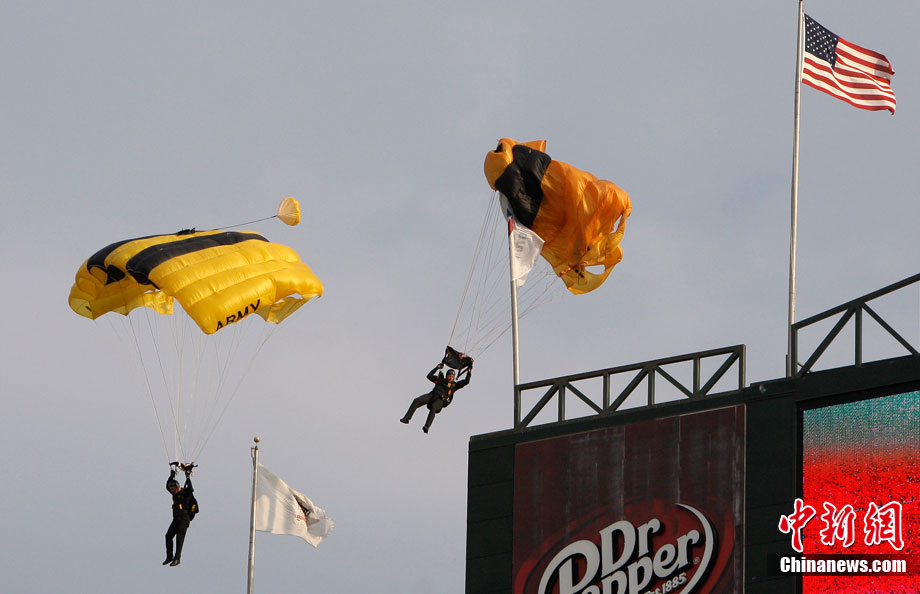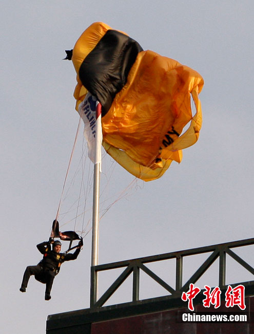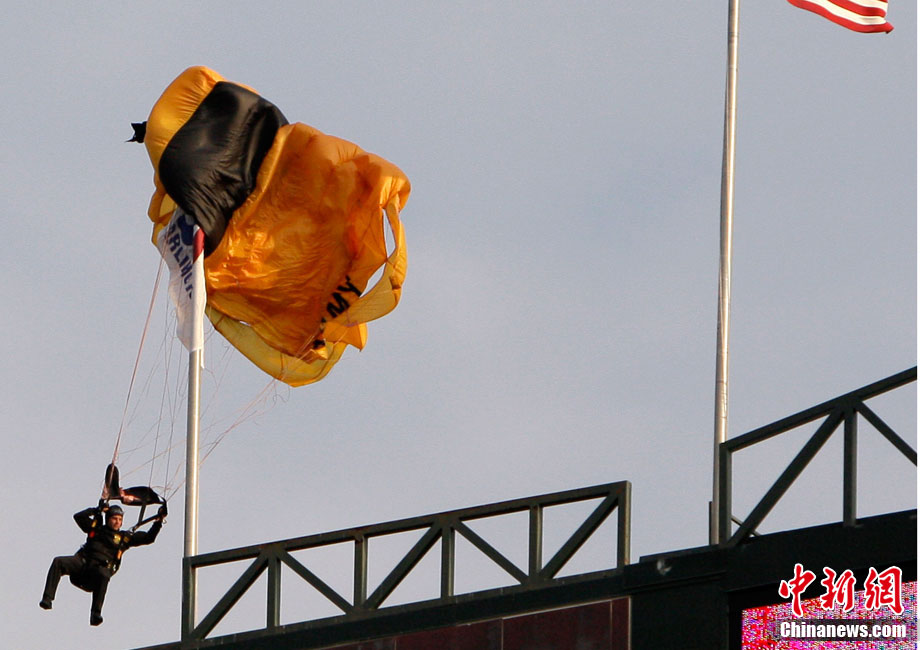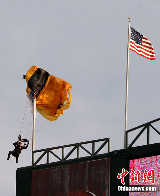 當(dāng)?shù)貢r(shí)間8月24日,一名美國(guó)陸軍的傘兵在美國(guó)德克薩斯州阿靈頓棒球比賽開始前的表演中不小心被棒球場(chǎng)旁的旗桿絆住降落傘,掛在了半空中。據(jù)悉,當(dāng)時(shí)這名傘兵從德克薩斯州阿靈頓上空跳傘,原本預(yù)計(jì)著陸在一塊空地,結(jié)果降落傘被棒球場(chǎng)邊的旗桿勾到,被掛在了旗桿上。隨后他在球場(chǎng)工作人員的幫助下獲救。