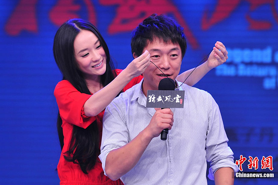8月26日,影片《精武風(fēng)云·陳真》在北京舉行終極版預(yù)告片發(fā)布會,演員黃渤、霍思燕、木幡龍紛紛亮相。圖為霍思燕在現(xiàn)場激情擁吻黃渤,讓“影帝”驚喜不已,現(xiàn)場一片驚呼。中新社記者 李學(xué)仕 攝
