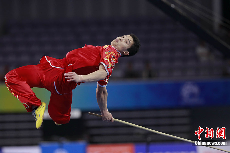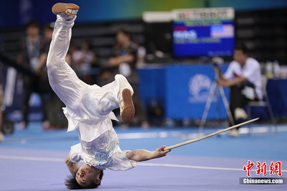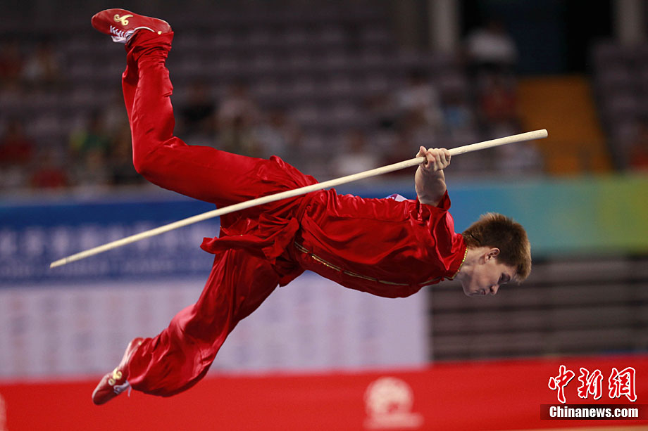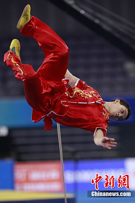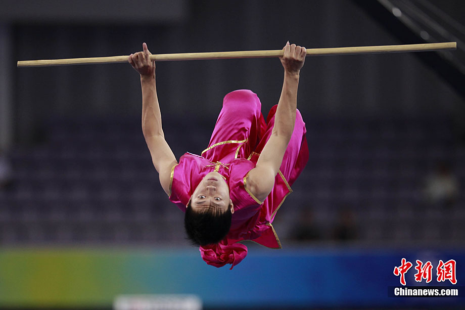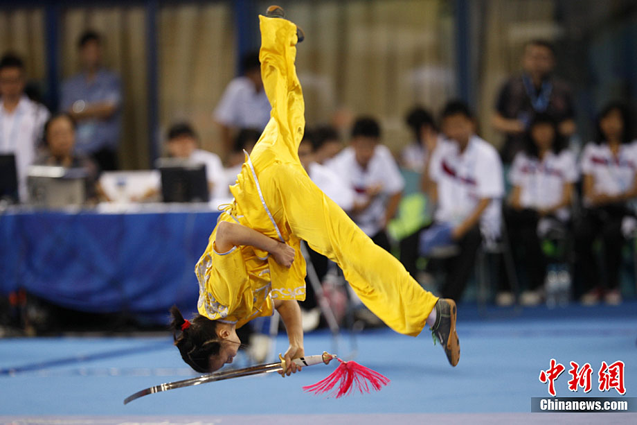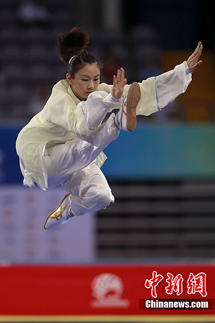 8月28日,2010年北京首屆武會(huì)進(jìn)行首日比賽,其中武術(shù)項(xiàng)目的比賽在北京奧林匹克體育中心體育館進(jìn)行。圖為中國(guó)香港選手Zheng Tian Hui在女子劍術(shù)的比賽中以9.80分穩(wěn)居第一位。中新社記者 盛佳鵬 攝
