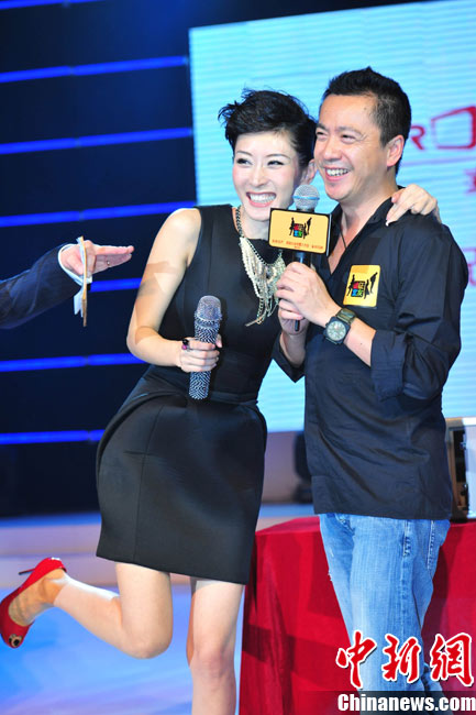 8月30日,著名主持人李霞在北京簽約華誼兄弟,宣布成立李霞工作室,聯(lián)手東方衛(wèi)視,推出大型真人秀節(jié)目《誠征室友》。娛樂主播一姐李霞親挑大梁的《誠征室友》是以年輕人合租生活為主題的全新節(jié)目,主題圍繞年輕人關(guān)注的“蝸居”、“合租”、“買車”等熱門話題展開。當天,李霞身穿黑色禮服勁舞出場,震撼宣布“復(fù)出”。心情大好的她“拳打”老板王中磊大開玩笑。前來捧場的張紀中更是向她支招,讓王中磊多給股份。圖為李霞“拳打”老板王中磊秀親熱。中新社記者 李學(xué)仕 攝