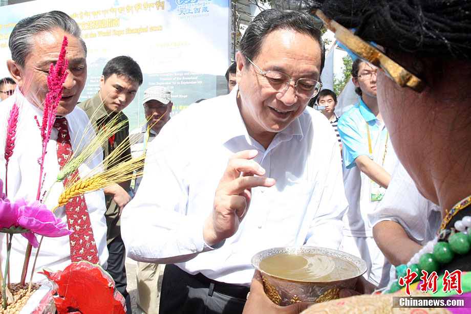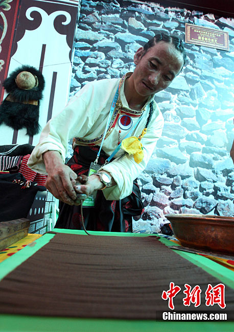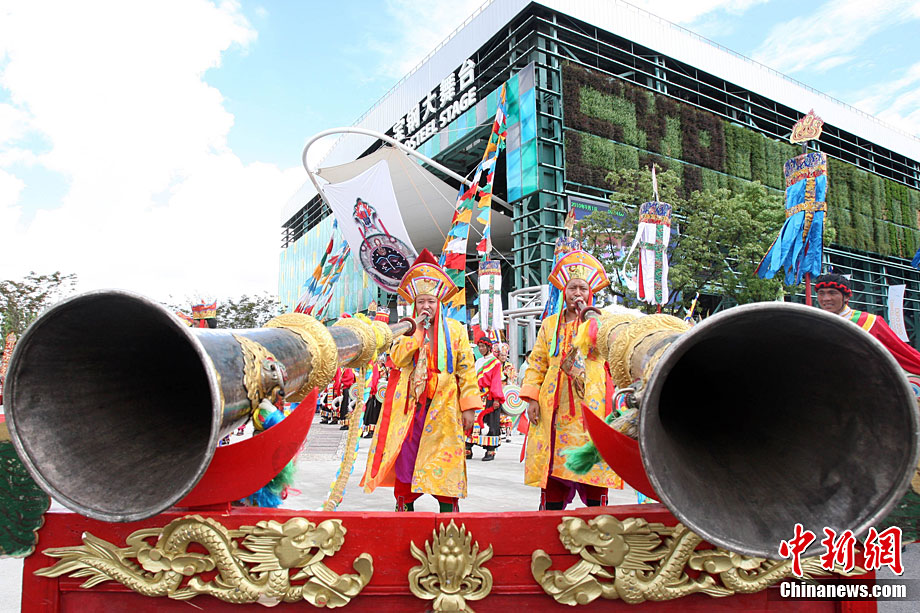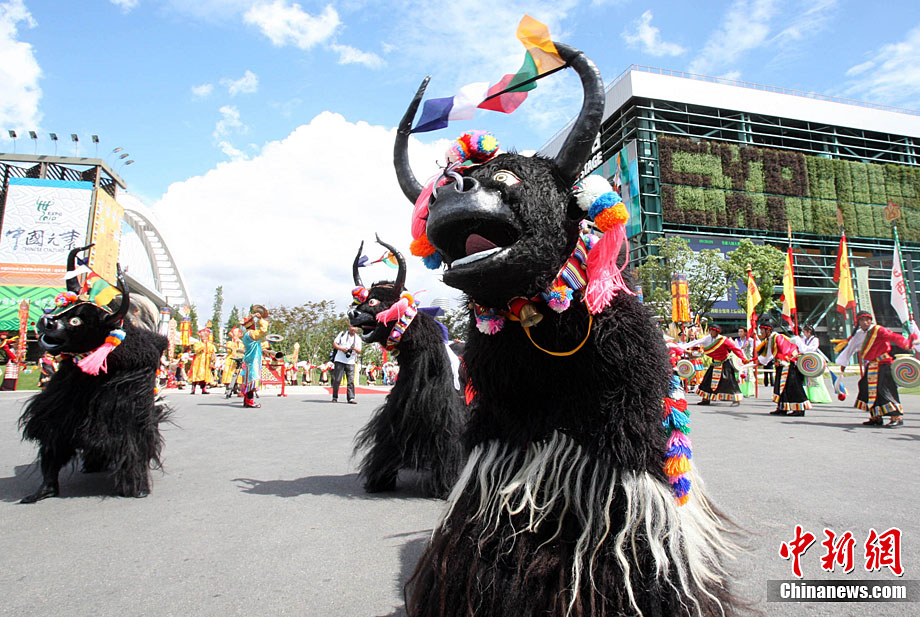 9月1日,為期5天的上海世博會西藏周在世博園拉開帷幕;顒又芷陂g,將先后有《天上西藏》寶綱舞臺演出、非物質(zhì)文化遺產(chǎn)展示、街頭花車巡游表演、慶典廣場《雪域歡歌》、特色產(chǎn)品展示等活動與參觀者見面,全方位展示西藏人文魅力。圖為西藏活動周開幕現(xiàn)場吹響開幕號。中新社記者 湯彥俊 攝